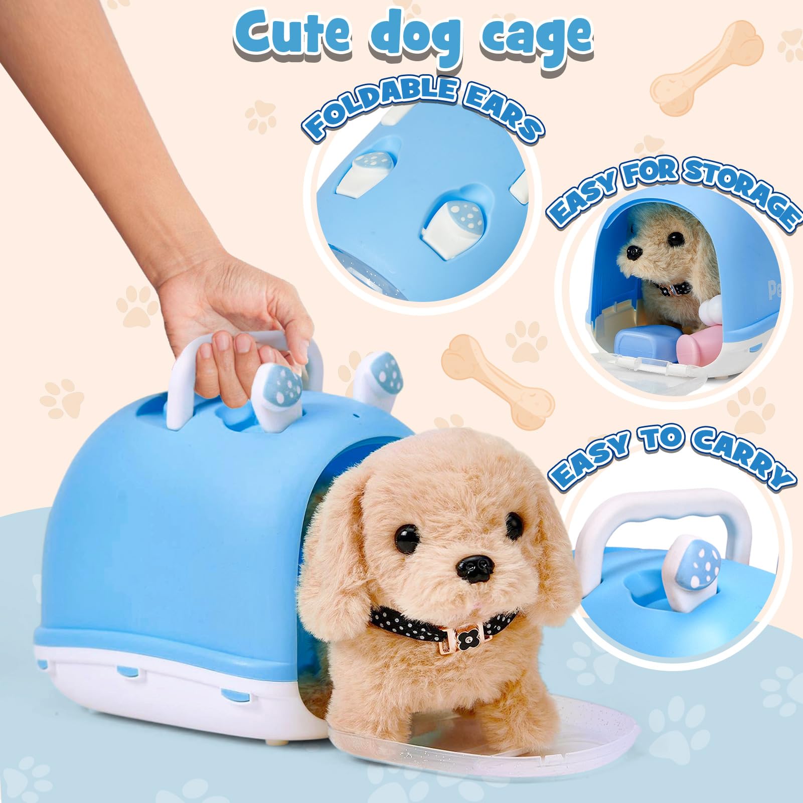 - Tragbare Hundekäfig, Spielen Überall: Unsere Hundekäfig können der Plüsch Hund und alle Hundespielzeuge aufbewahrt werden. Dank des tragbaren Griffs können Kinder sie bequem beim Ausgehen oder auf Reisen tragen und jederzeit und überall mit ihrem hund spielen. Ziehen Sie Ihrem Welpen das süße Outfit an, befestigen Sie die Leine und erleben Sie realistischen Hundespaziergang mit niedlichem Hundegebell. Mit einem Plüschtier als Begleiter fühlen sich Kinder nie wieder einsam oder gelangweilt.