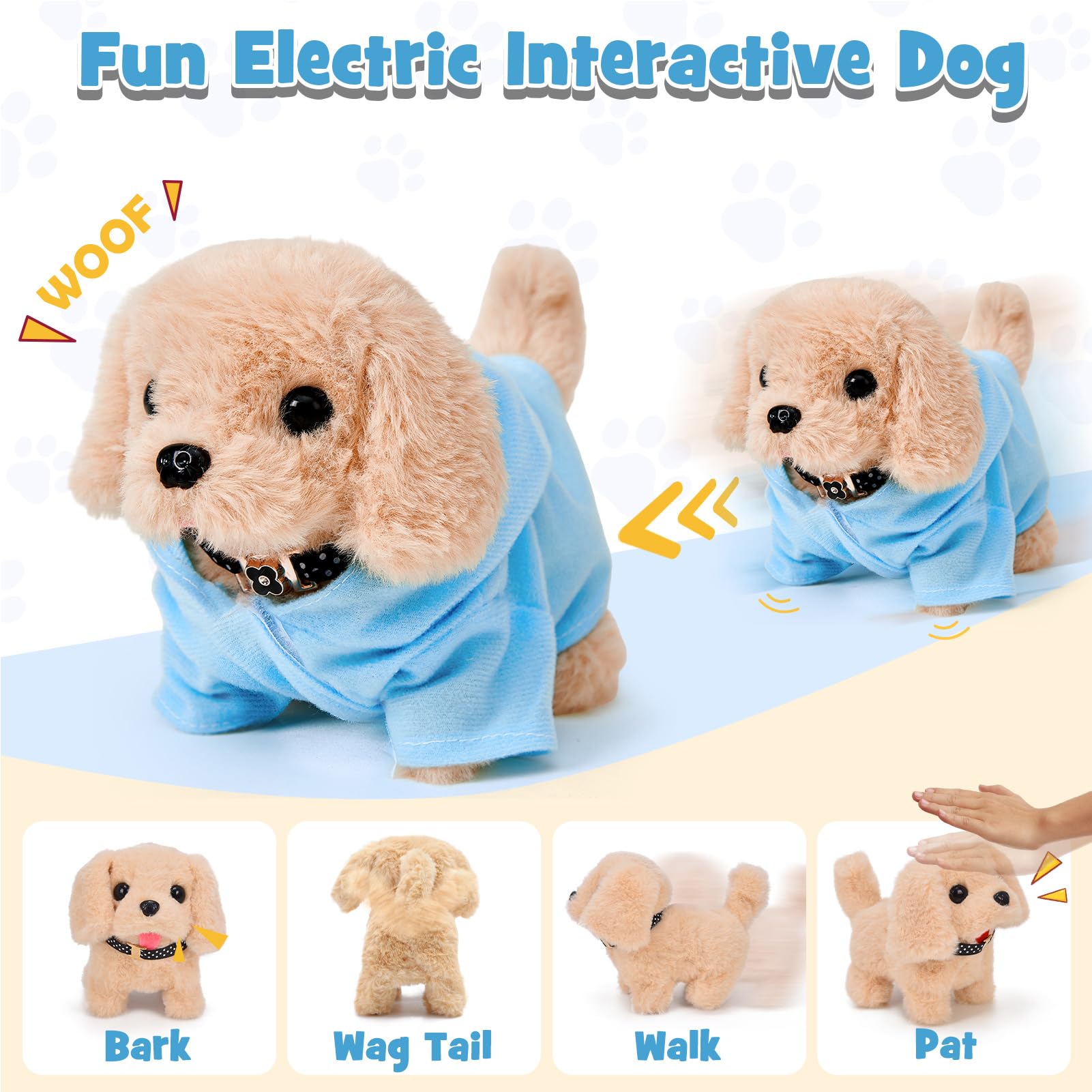 - Elektronisches Haustier Spielzeug und Rollenspiel Set: Enthält einen elektrischen Hund (14 x 19 cm), einen Hundekäfig aus Kunststoff (15 x 14 x 18,5 cm) und jede Menge interaktives Spielzeug – süße Kleidung, Hundebett, Hundeleine, Halskrause, Napf, Knochen, Kamm, Spiegel, Föhn, Parfüm und Shampoo. Ein perfektes Geschenk für Jungen und Mädchen 3 4 5 6 Jahren, die sich einen Welpen wünschen. Kinder können mit dem Hund spazieren gehen und die tägliche Routine der Haustierpflege simulieren.