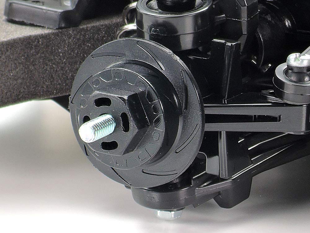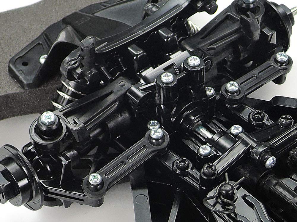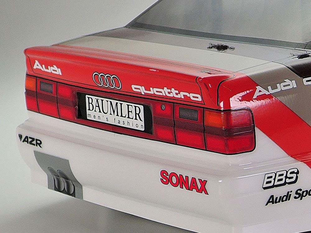 Art.Nr.: 300058682 Art.bezeichnung: 1:10 RC Audi V8 Tourenwagen (TT-02) Der Audi V8 fuhr 1991 in der Deutschen Tourenwagen Meisterschaft (DTM). Pilotiert wurde dieser V8 damals von Frank Biela, der insgesamt 4 Saisonsiege einfahren konnte und sich damit am Saisonende den Gesamttitel sicherte. Als Basis dient dem 58682 TAMIYA Modell im Maßstab 1:10 das TT-02 Chassis. Bei diesem sind Radstand, Bodenfreiheit, Spur und Getriebeübersetzung vielfach einstellbar und mit den unzähligen optionalen Tuningteilen lässt sich das Chassis schnell zum Racer tunen. Der 4WD-Antrieb mit zentraler Welle, doppelte Querlenker und Federbeine an allen vier Rädern sorgen für ein vorbildgetreues Fahrbild und beste Traktion. Die Chassisunterseite ist extra glatt gestaltet und das Batteriefach nimmt alle gängigen Akkutypen auf. Optisches Highlight sind die Radmitnehmer, die angesetzte Bremsscheibenattrappen haben. Benötigtes Zubehör: Fernsteuerung mit Empfänger, Lenkservo, 7.2V NiMH Akkupack, Ladegerät, Farbe für Polycarbonatkarosserie (TAMIYA PS-) - Bausatzmodell im Maßstab 1:10 - Einsteigerfreundliches TT-02 Chassis - extrem robust - gekapselter 4WD Allradantrieb - vorbildgetreue, Polycarbonat Karosserie - Dekorbogen Auto No.45 von 1991 Frank Biela - Seitenspiegel - 2-teilige Felgen mit Slick-Reifen - kräftiger 540er Elektromotor "Torque-Tuned" - Einzelradaufhängung vorne und hinten - elektronischer brushless/brushed Fahrtenregler - viele Tuningteile optional erhältlich Bausatzmodell mit auführlich bebilderter Aufbauanleitung, Elektronischer brushless/brushed Fahrtenregler, 540er Elektromotor, Polycarbonatkarosserie