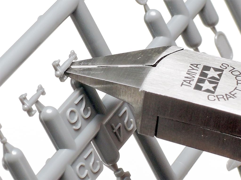 • TAMIYA Logo am Seitenschneider: Das Werkzeug ist mit dem Twin Star-Logo und TAMIYA CRAFT TOOLS FOR PLASTIC gekennzeichnet.