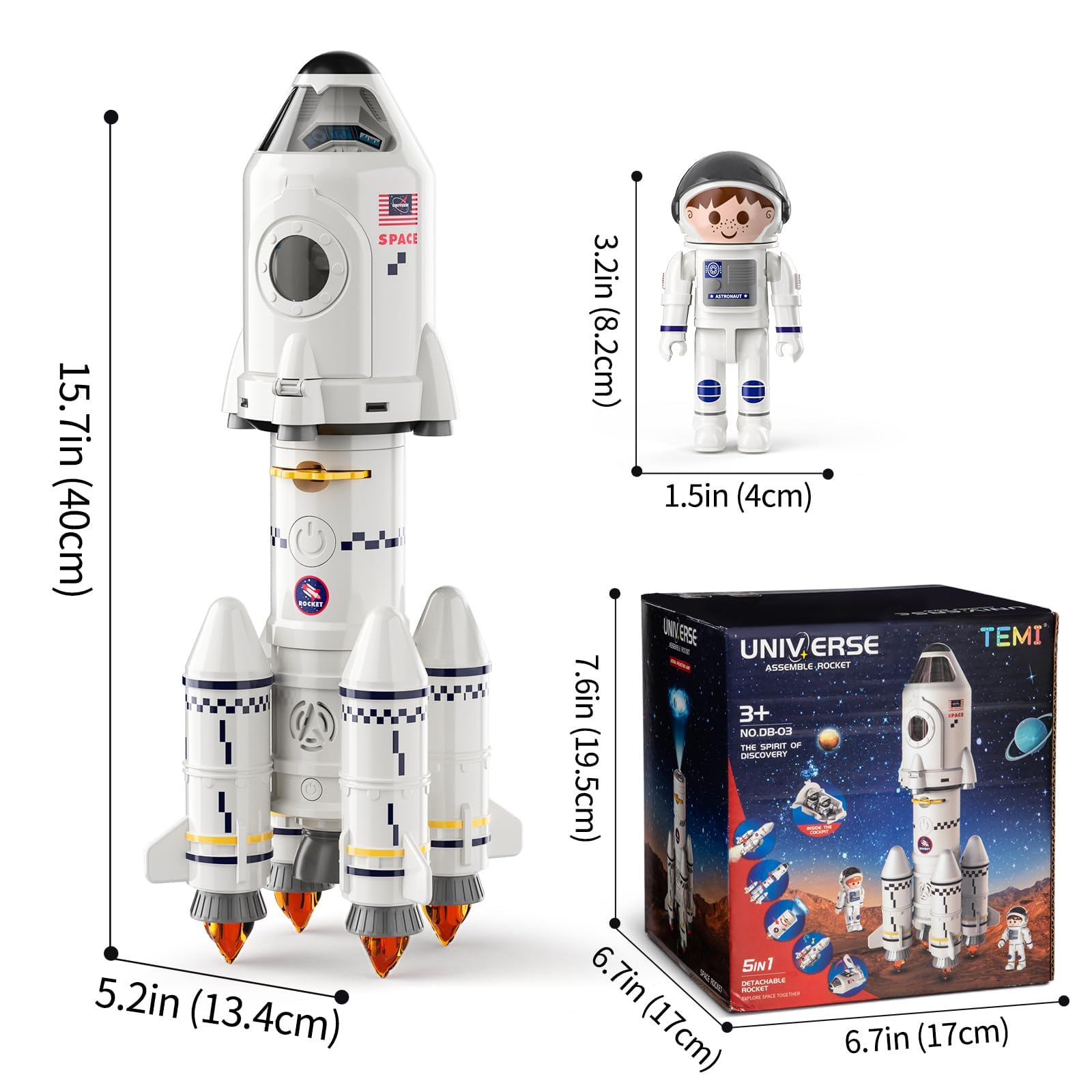 - Abnehmbare 5-in-1 Rakete - Die Rakete besteht aus zwei Astronauten, einem Raumschiff, einer Rakete der ersten Stufe, einer Rakete der zweiten Stufe und 4 Boostern. Abnehmbare Baugruppe. Die Astronauten sind auch beweglich, und Kinder können bei einem kosmischen Abenteuer Rollenspiele spielen! Jede Kapsel kann unabhängig oder eine integrierte Rakete sein. Außerdem können Kinder spielerisch den Aufbau von Raketen kennenlernen.