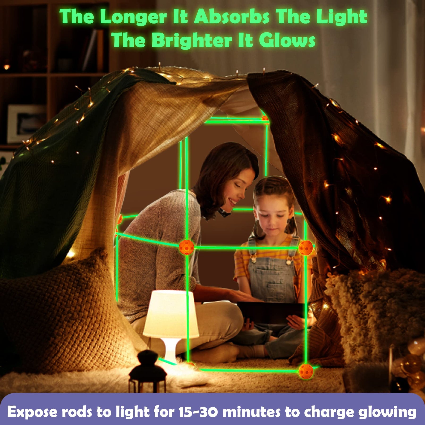 • Im Dunkeln Leuchten: Fügen Sie doppelt so viel Sicherheit und Eco hinzu, kein radioaktives Phosphorpulver. Verdoppeln Sie die Helligkeit und halten Sie die Helligkeit um 50 % länger. Dies ist ein perfektes Fort-Kit für Übernachtungen der Träume eines jeden Fortbauers. Setzen Sie die im Dunkeln leuchtenden Stäbe 15–30 Minuten lang dem Licht aus, um sie zum Leuchten aufzuladen. Je länger es das Licht absorbiert, desto heller leuchtet es.