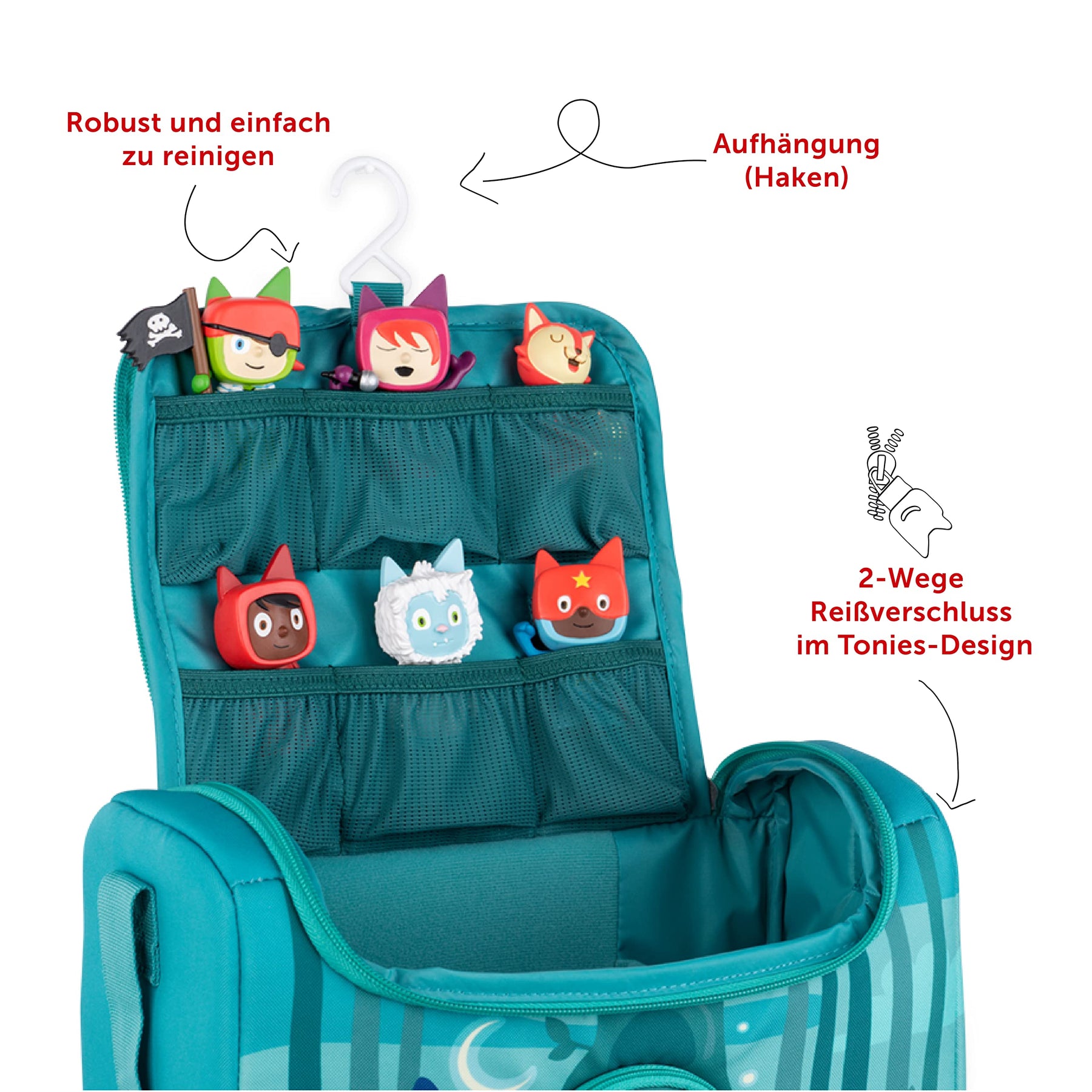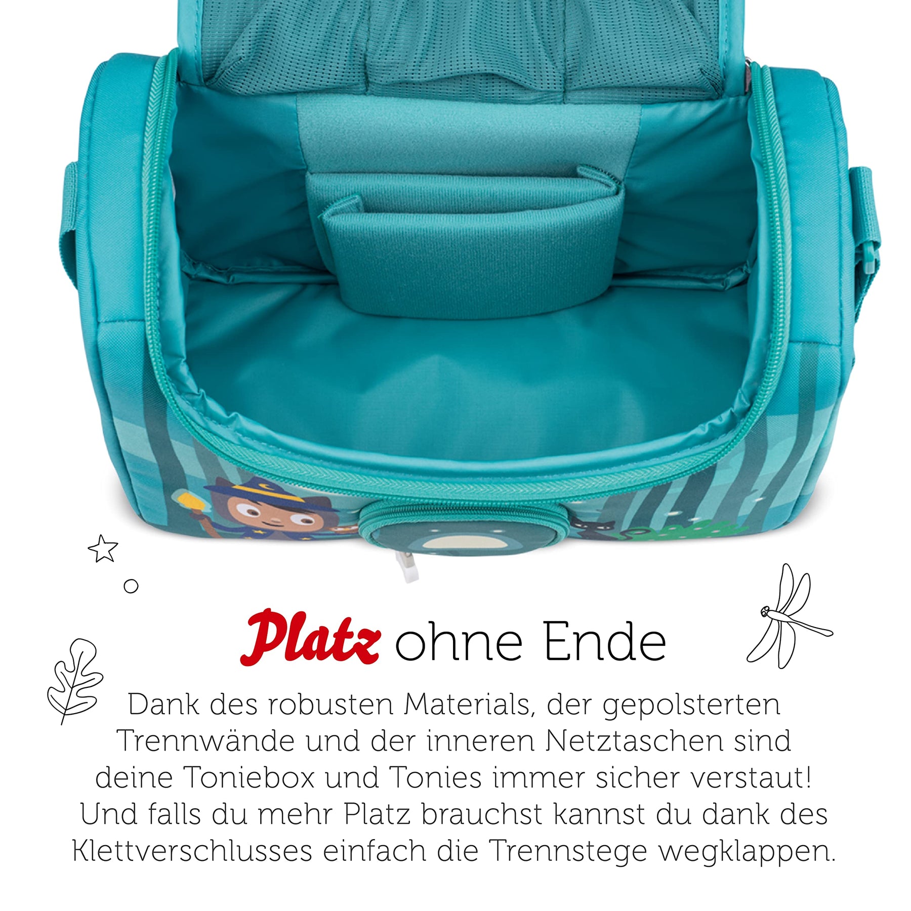 - Lieferumfang & Details – 1x Tonie-Transporter "Unter dem Zaubermond" für unterwegs, mit Platz für mind. 6 Tonie-Figuren, Toniebox und Zubehör, Material: 100 % PET, Maße: 28 x 13 x 19 cm