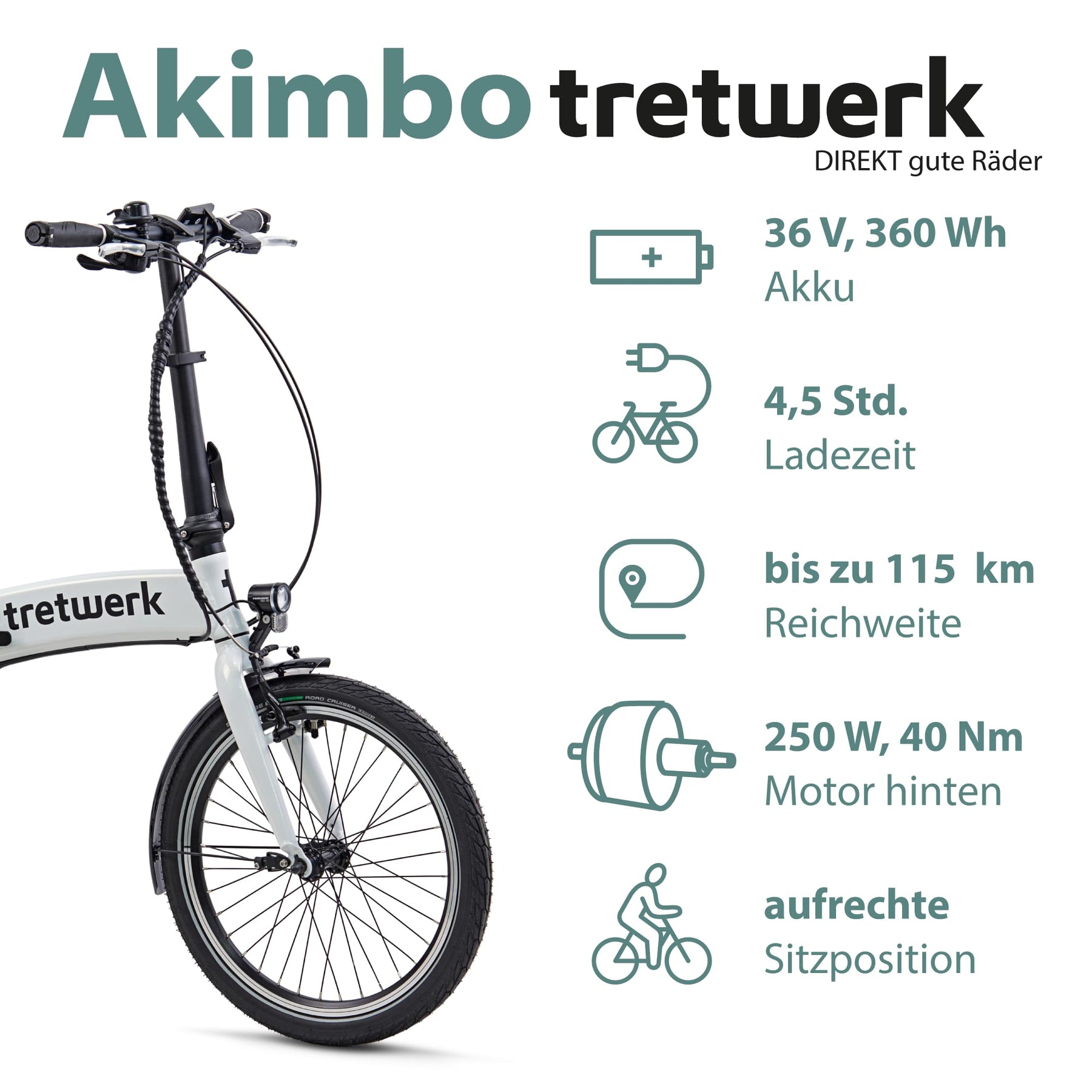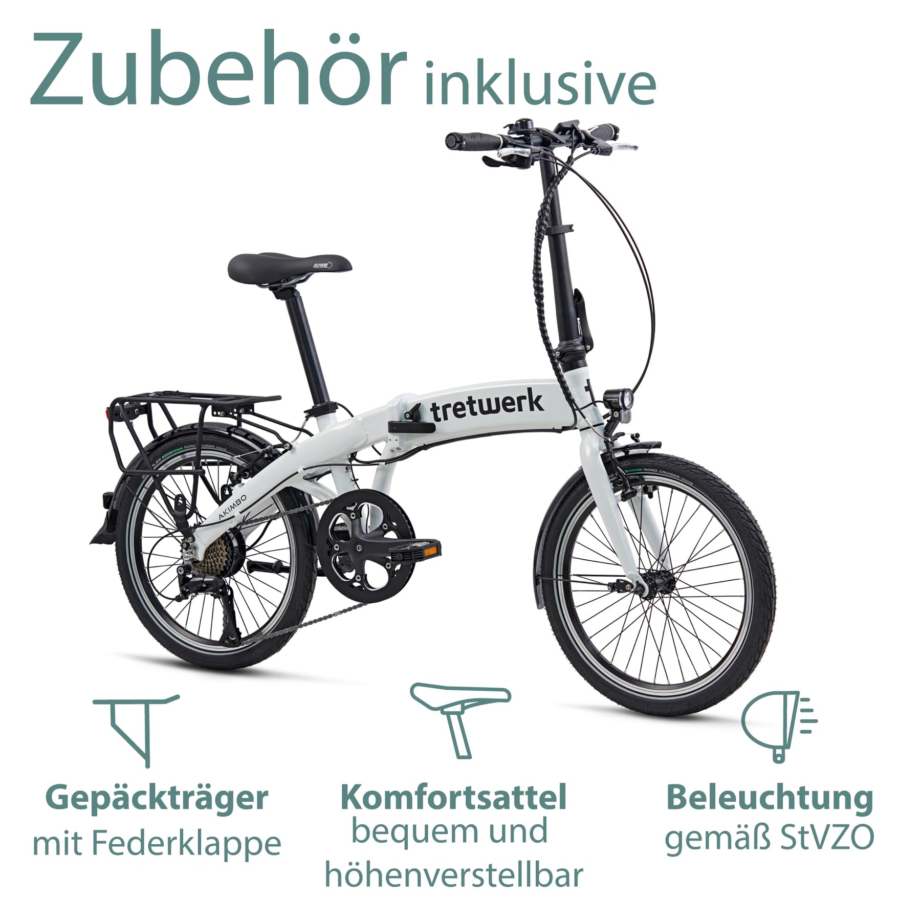 TRETWERK 20 Zoll E-Bike Klapprad - Akimbo - Faltrad Pedelec mit 8 Gang Kettenschaltung - klappbares Elektrofahrrad mit Heckmotor 50Nm - - weiß
