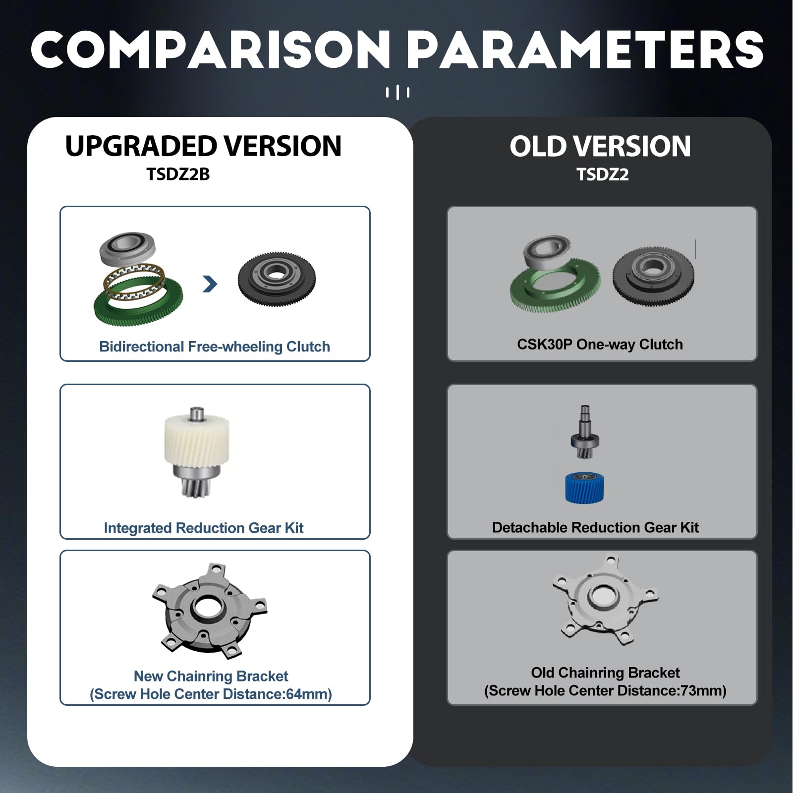 - Die 2024-Version des TSDZ2B 48V 500W-Mittelmotor bietet eine signifikante Leistungssteigerung und eine neue Kupplungstechnologie am großen Zahnrad, die einen sanfteren, effizienteren Betrieb und eine längere Lebensdauer ermöglicht. Das 48V-Modell erzeugt ein Drehmoment von 80Nm und besitzt eine IP54-Zulassung, was eine zuverlässige Leistung in verschiedenen Bedingungen gewährleistet