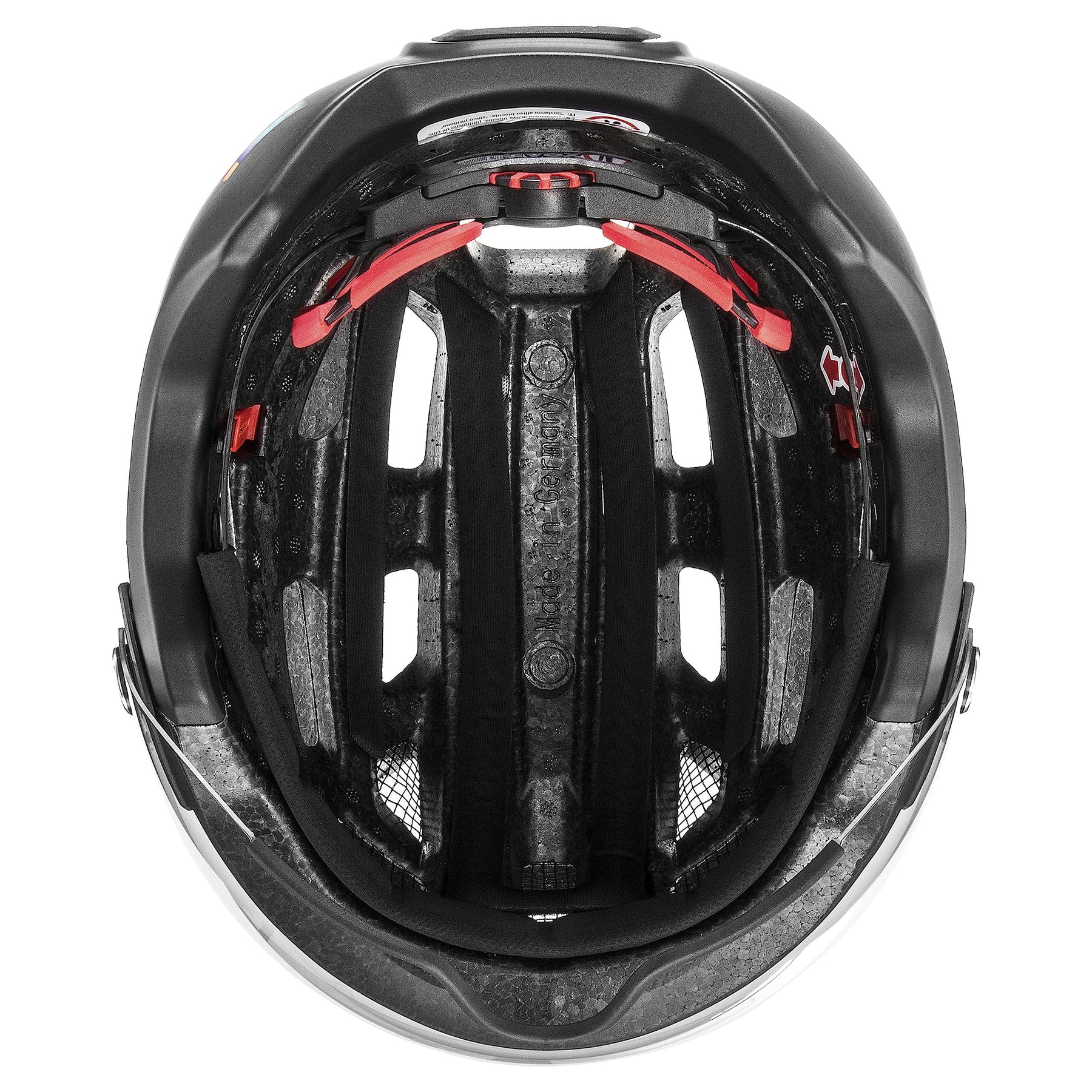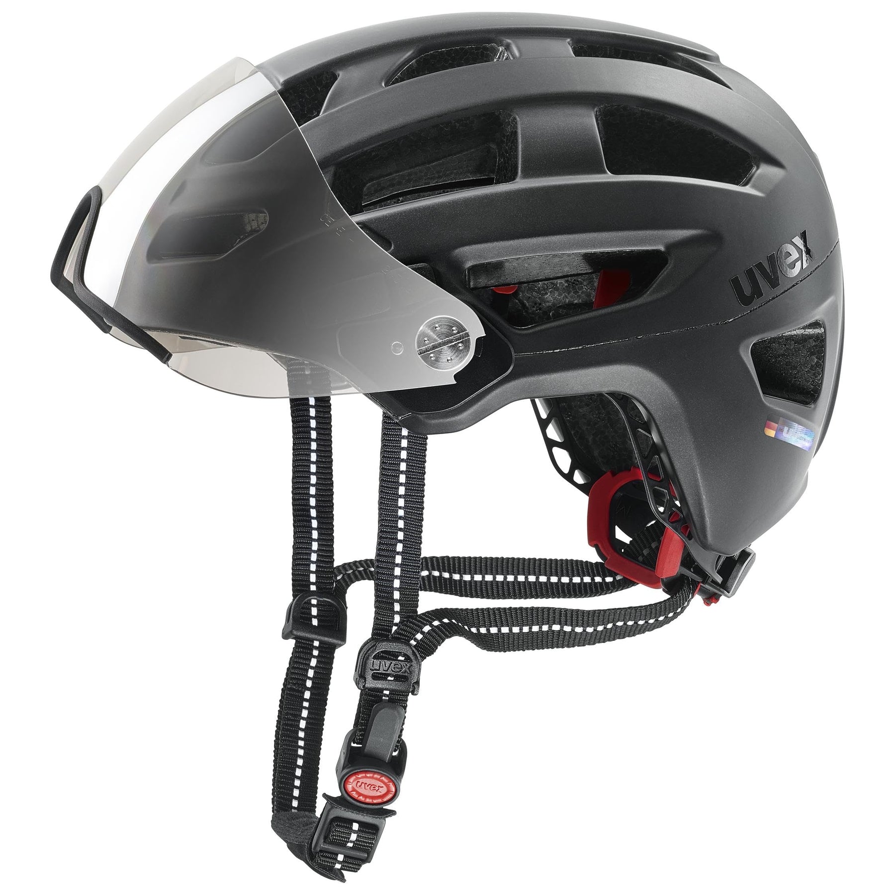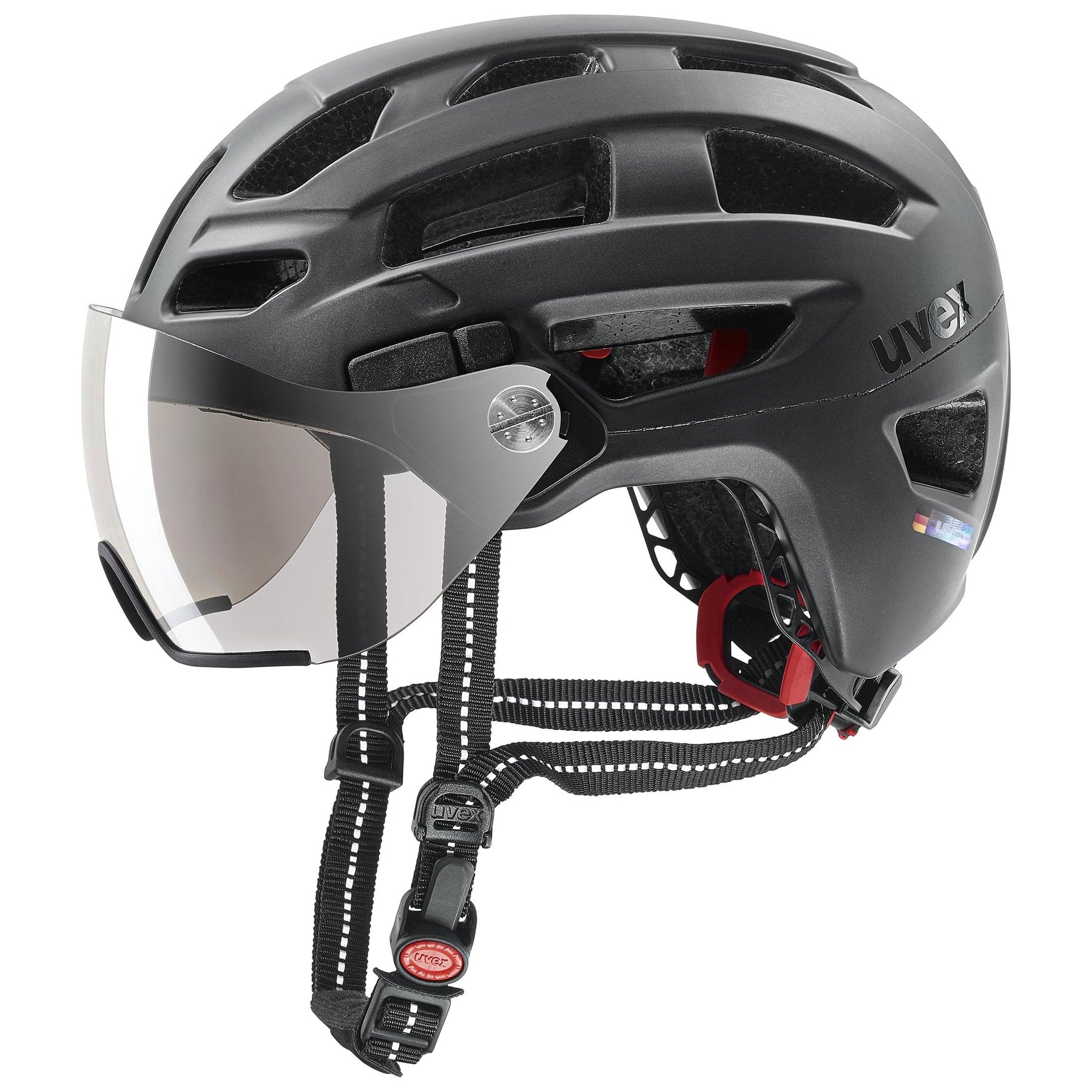 Aufsteigen, Visier runter und los geht's. Das Fahrrad wird künftig zum wichtigsten Verkehrsmittel im urbanen Raum. Es verspricht Unabhängigkeit und Lebensqualität. Um dies auch nutzen zu können, braucht es Accessoires, die den Radfahrer optimal auf seinem täglichen Weg zur Arbeit, zum Einkaufen oder ins Café schützen. Der neue uvex finale visor ist einer von ihnen. Er ist der erste Inmould-Helm, der mit einem integrierten Visier ausgestattet ist. Das Allwetter-Visier in litemirror silver (Schutzstufe 1) schützt die Augen im Straßenverkehr optimal vor Sonne und Wind. Egal ob bei Tag oder in der Nacht: Der uvex finale visor kann locker über der Korrekturbrille getragen werden. Zudem ersetzt das Visier mühelos die Sonnenbrille und erweitert das Sichtfeld. Pluspunkt: Selbst durch tränende Augen verschmierte Mascara ist damit passé. Für einen höheren Sonnenschutz kann das Visier gegen ein dunkleres in Schutzstufe 3 getauscht werden. Die Formensprache des uvex finale visor stammt aus dem Mountainbike-Bereich. So versprechen tief heruntergezogene Seitenteile und mehr Fläche am Hinterkopf zusätzliche Sicherheit. Über das uvex IAS-System lässt sich der Helm in der Weite anpassen. Zwanzig Belüftungsöffnungen und innen verlaufende Ventilationskanäle sorgen für optimale Luftzirkulation und einen kühlen Kopf im dichten Straßenverkehr. Das inkludierte Plug-In LED und die reflektierenden Straps und Logos bieten in der Dämmerung zusätzliche Sicherheit und Sichtbarkeit. Gemacht für: Visier-Enthusiasten Besonderheiten: Double-Inmould-Konstruktion, IAS-Größenverstellsystem, 20 Belüftungsöffnungen, Visier in litemirror silver (S1), inkludiertes Plug-In LED, reflektierende Straps und Logos