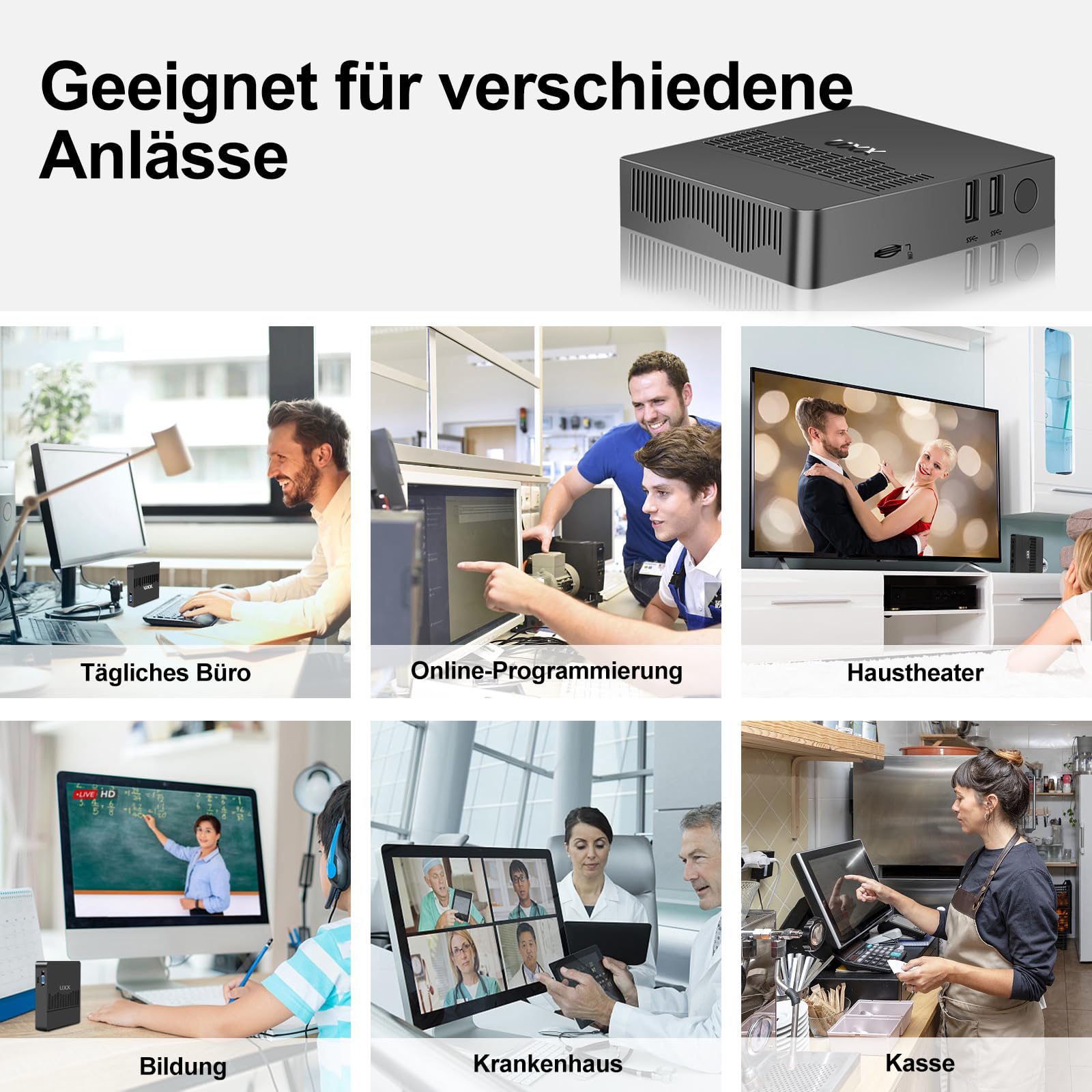 - Voll funktionsfähiger Mini-PC: Der Mini-Computer bietet schnelle und reibungslose Leistung, schnellere Reaktionszeit und höhere Arbeitseffizienz, mit einem Nutzungserlebnis, das dem eines Desktop-Computers nahekommt. Die grundlegende Betriebsfrequenz des Mini-Desktop-Computers beträgt 1,1 GHz/s. die maximale Frequenz beträgt 2,4 GHz. Die Festplatten-Kühlabdeckung hilft dem PC, den CPU-Prozessor zu kühlen, und die Lagertemperatur kann zwischen -20 und 70 °C gehalten werden.