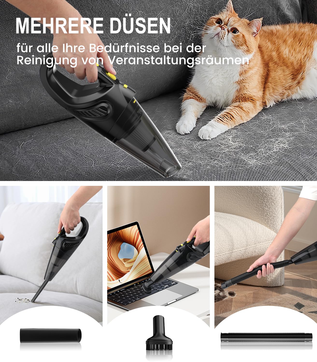 - Starke Saugkraft für effiziente Reinigung - Unser Handstaubsauger ist mit einem leistungsstarken Hochgeschwindigkeitsmotor ausgestattet, der eine hervorragende Saugkraft von 9000PA liefert, um effizient Tierhaare, Staub, Schutt und Krümel aus Auto, Büro und Haus zu entfernen. Und es ist ein guter Helfer für Sie, um Ihre Umgebung in einer Sekunde neu aussehen zu lassen und ein bequemeres Leben zu genießen.