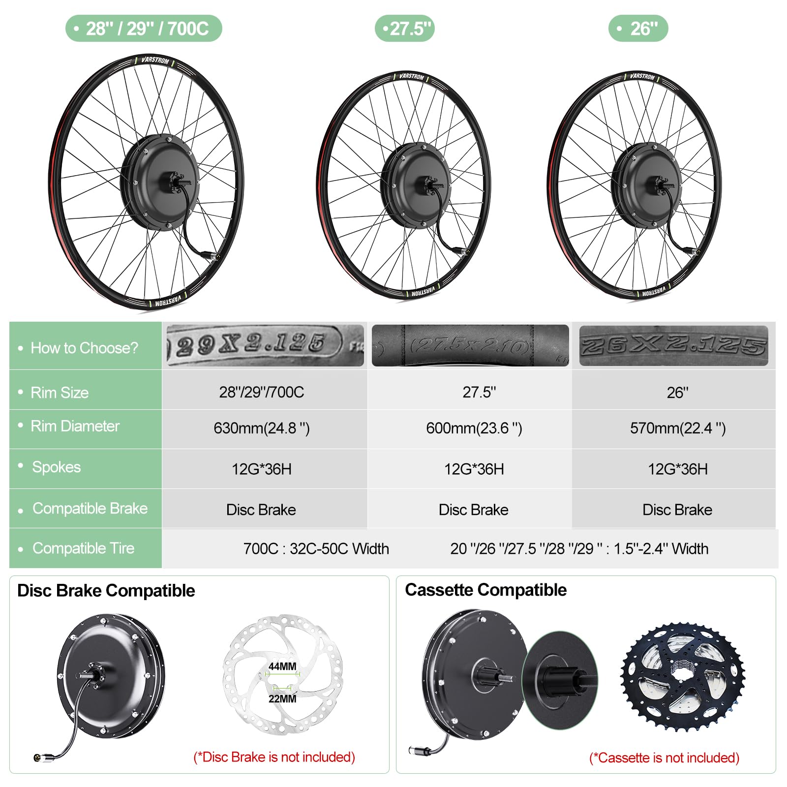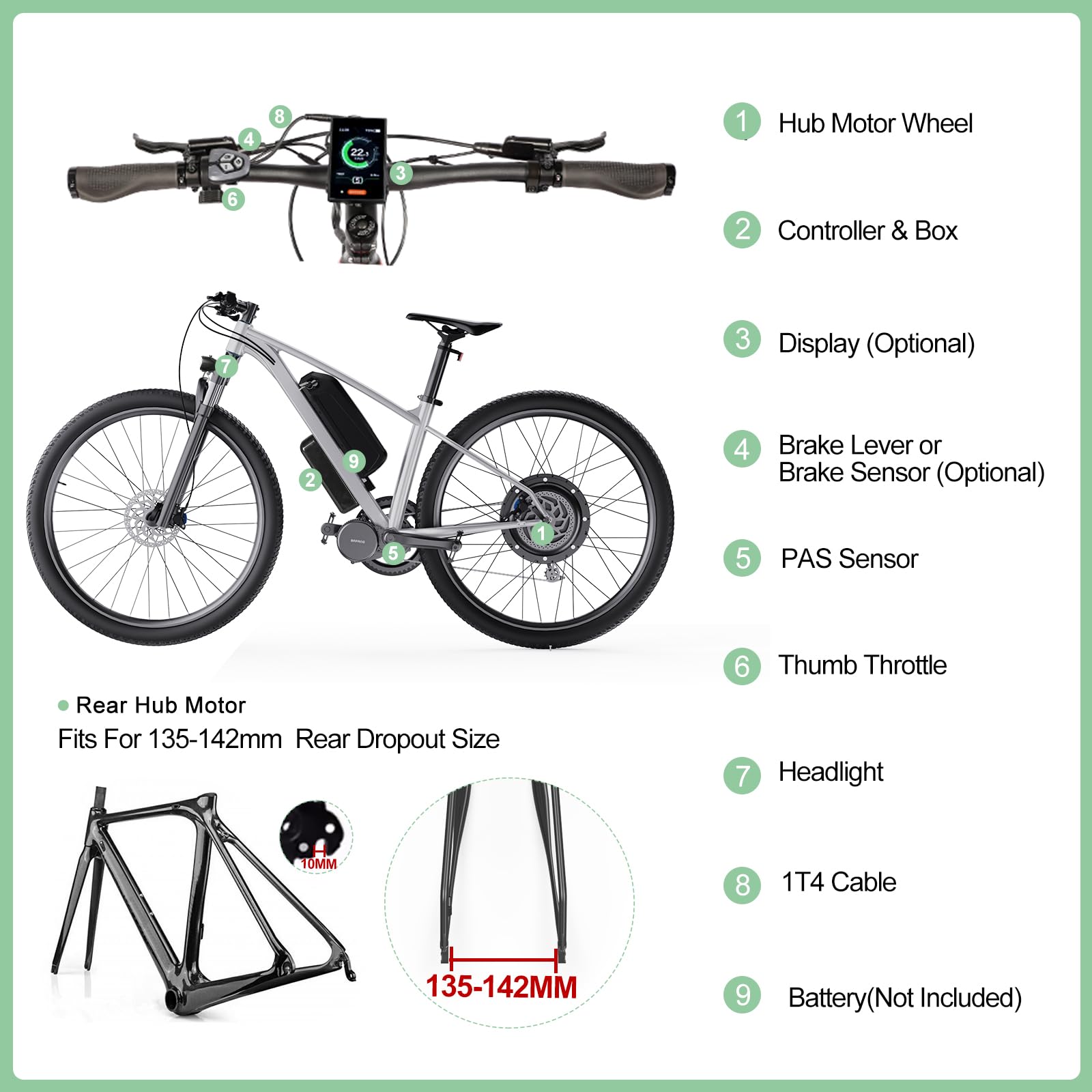 [ Universelle Kompatibilität ] Dieses E-Bike-Umrüstkit, das für den Austausch traditioneller Räder entwickelt wurde, passt für Fahrräder aus Aluminiumlegierung mit einer hinteren Einbaubreite (Hinterradgabelbreite) von 135-142mm und einer 10-Gang-Kassette oder weniger. Es ist nur für Kettentrieb-Systeme mit Scheibenbremsen geeignet