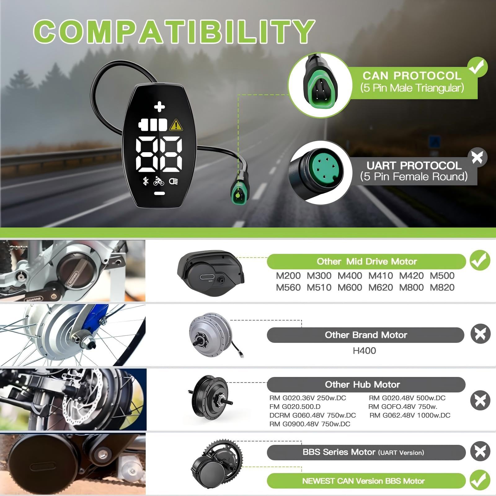 - Kompatibilität: Das Varstrom VD03 Display verfügt über einen dreieckigen Stecker, der speziell für BAFANG-Motoren mit CAN-Protokoll entwickelt wurde. Es ist kompatibel mit den neuesten 2025-Versionen der BBS01B, BBS02B und HD Mittelmotoren, die auf CAN aktualisiert wurden. Außerdem unterstützt es BAFANG Mittelmotor-Systeme wie M200, M400, M420, M500, M510, M600, M620, M625, M325 und M225