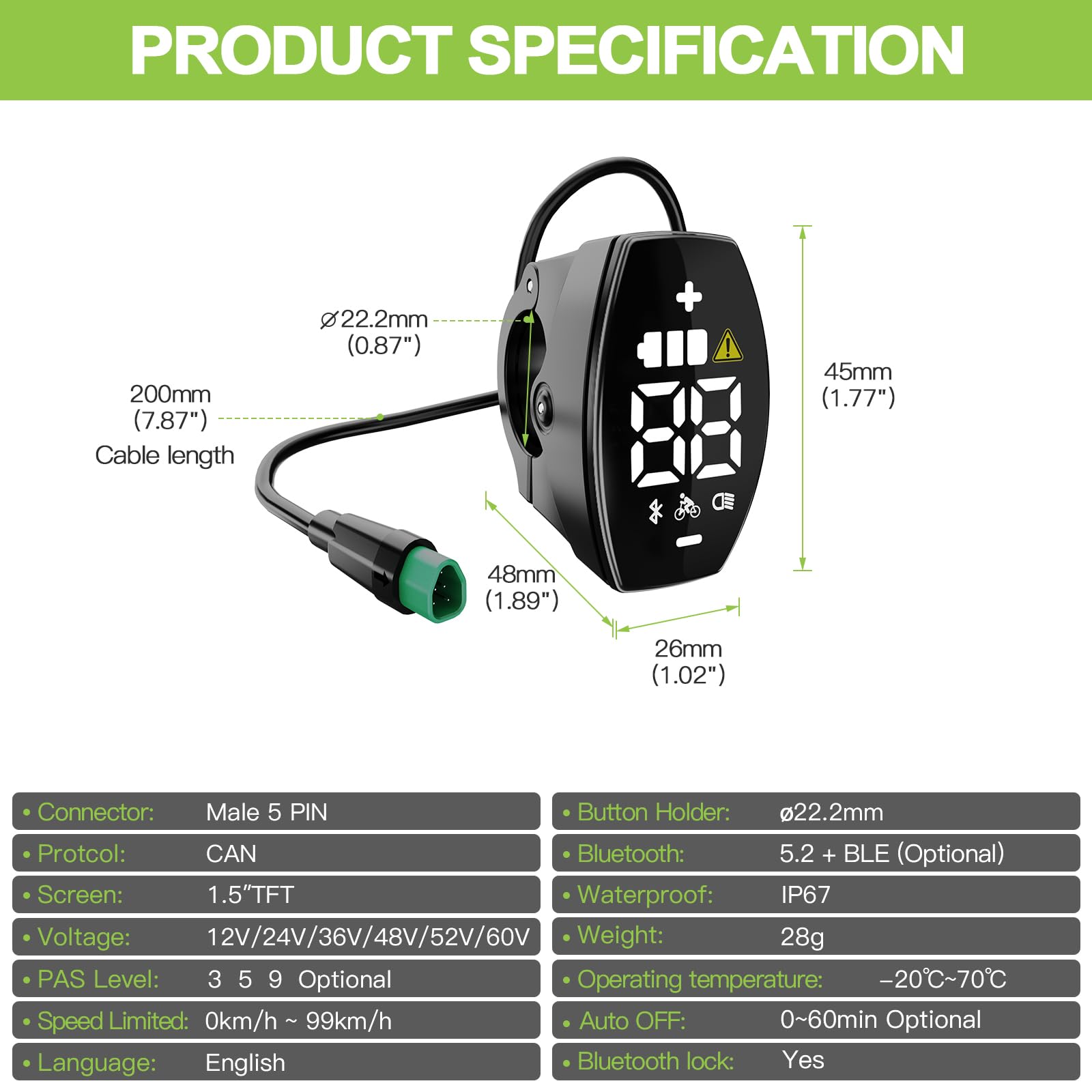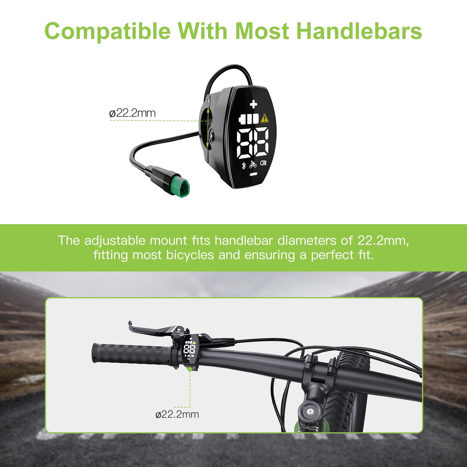 - Montagedimensionen: Das Display ist für Standardlenker mit 22,2 mm Durchmesser ausgelegt