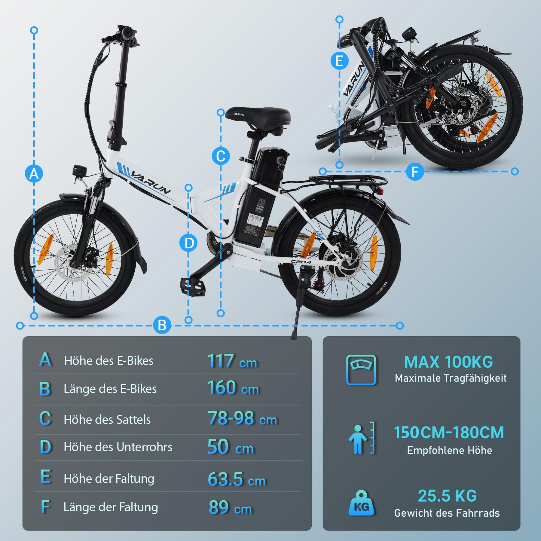 VARUN E Bike, 20 Zoll Ebike klapprad mit 48V Lithium-Akku, 250W Motor, E-Bike Damen Herren mit 5 Modi, 7-Gang Getriebe, Pedelec Elektrofahrrad City Ebike mit LCD-Display, EU-Konformes