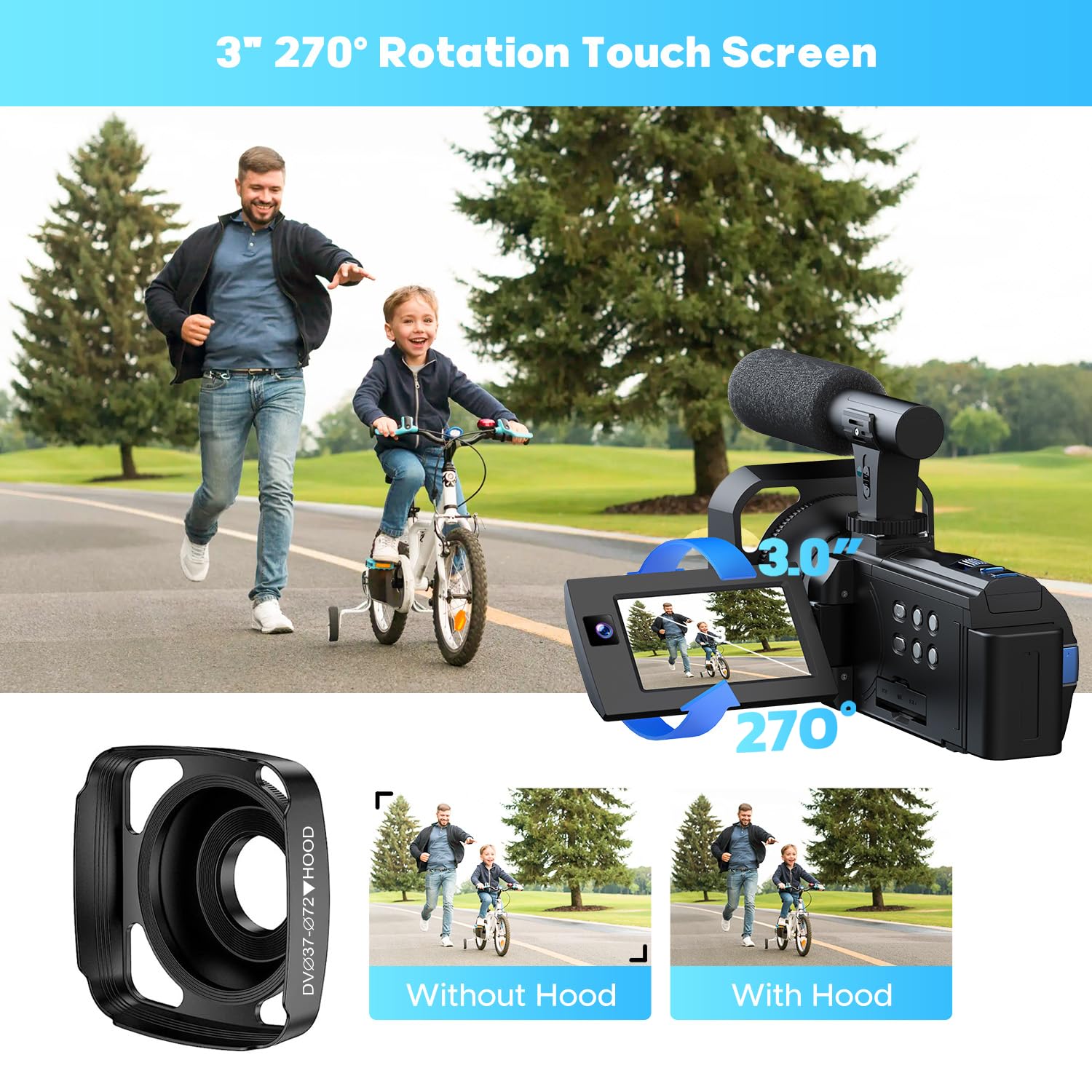 - 【5K-Dualkameras mit 64-GB-Speicherkarte】Diese Videokamera liefert hochauflösende 5K-Videos und 56-MP-Fotos für ein atemberaubendes Seherlebnis. Dank des 3,0 Zoll großen, um 270° drehbaren Displays können Sie Selfies aus jedem Winkel aufnehmen und Ihre Schönheit jederzeit bewundern. Der empfindliche Touchscreen macht lästige Tasten überflüssig und ermöglicht eine einfache Bedienung per Fingertipp. Diese digitale Videokamera unterstützt den 16-fachen Digitalzoom und ermöglicht so die Aufnahme weit entfernter Landschaften. (Hinweis: Autofokus und optischer Zoom werden nicht unterstützt.) Eine 64-GB-SD-Karte ist im Lieferumfang enthalten, sodass Sie keine zusätzlichen Käufe tätigen müssen.
