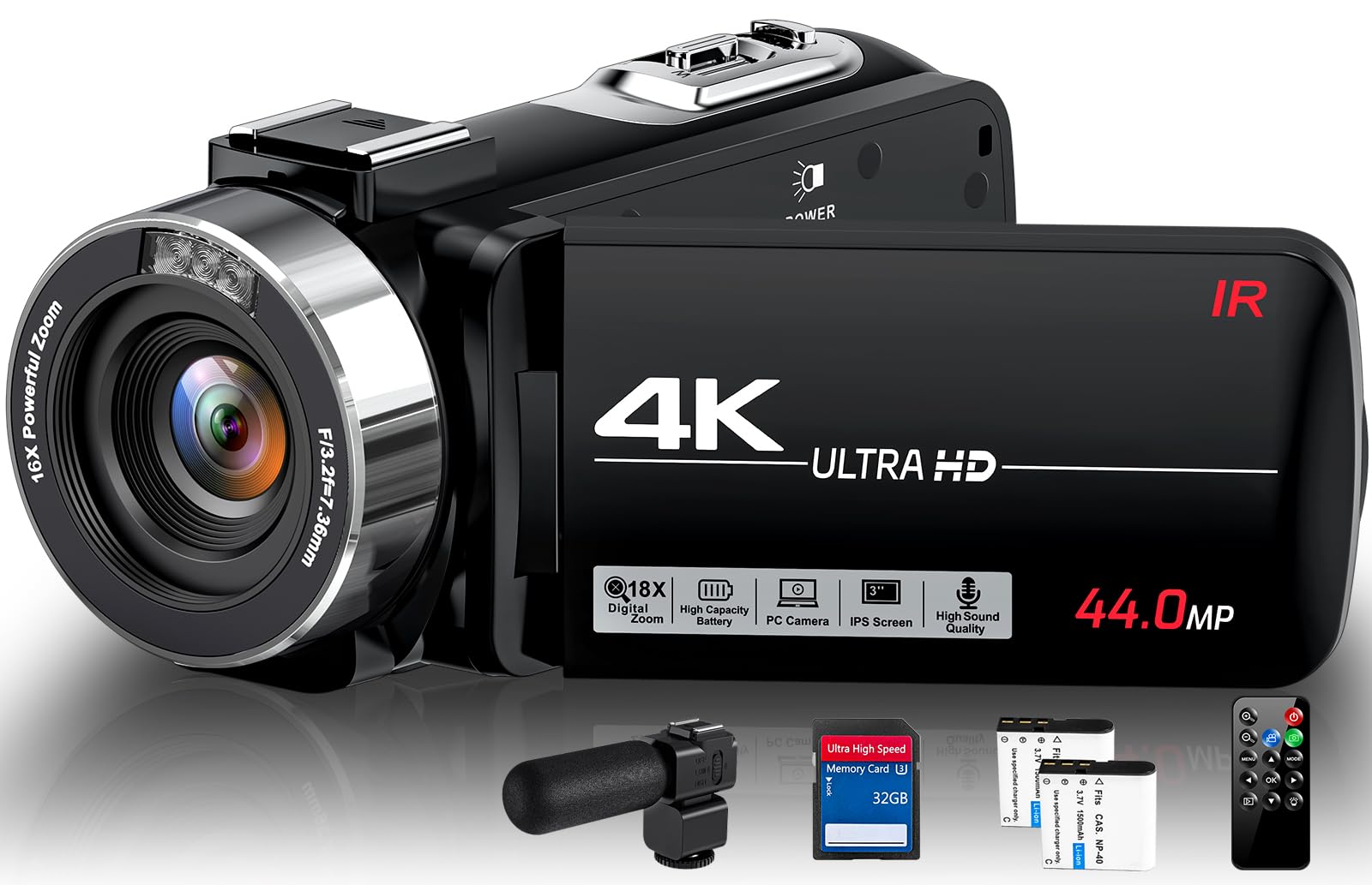 Videokamera Camcorder 4K, 44MP Vlogging Camera für YouTube, 18X Digitaler Zoom 3,0-Zoll-IPS-Bildschirm Kamera, IR Nachtsicht Webcam Videokamera mit Mikrofon, Fernbedienung, 2 Akkus und 32GB SD Karte