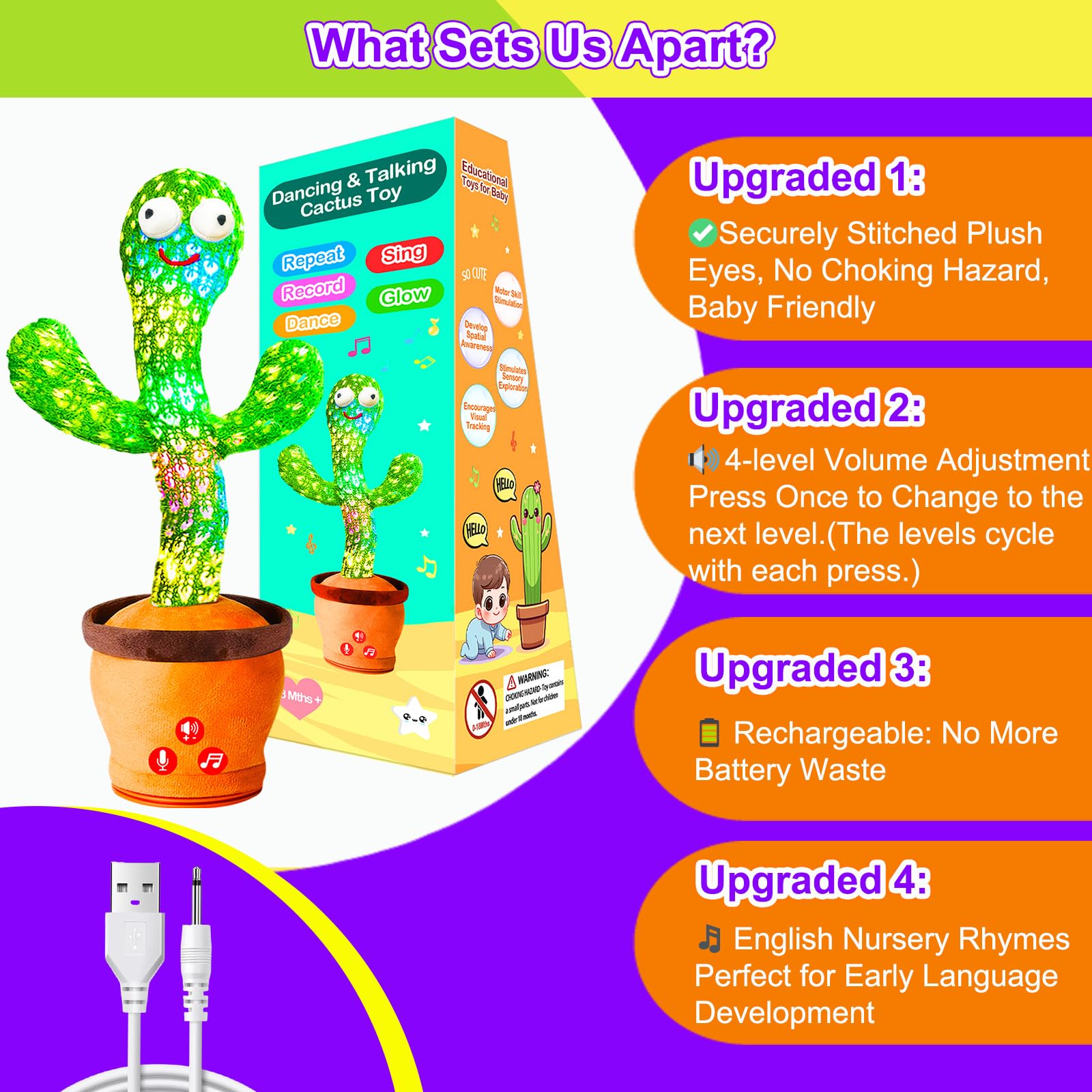 • Wiederaufladbares sprechendes Kaktus-Babyspielzeug mit Lautstärkeregelung - Kein ständiger Batteriewechsel nötig – unser Dancing Cactus Toy ist per USB wiederaufladbar. Die Lautstärke lässt sich einfach anpassen – ideal für unterschiedliche Umgebungen und die Bedürfnisse Ihres Kindes.