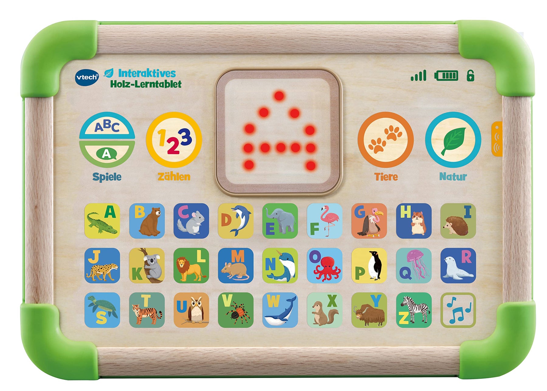FSC® N003551 Plastikanteile zu 90 Prozent aus wiederverwertetem Plastik; dies spart Müll und schont so die Umwelt Mit dem lustigen Holztablet Tiere, Buchstaben, Zahlen und die Natur entdecken 26 Buchstabentasten, um Buchstaben und ihre Laute sowie Tiere und ihre Lebensräume kennenzulernen Leuchtender LED-Bildschirm, auf dem Buchstaben und lustige Animationen zu sehen sind 4 Modustasten zu Buchstaben, Zahlen, Tieren sowie dem Wetter und um Suchspiele (nach bestimmten Buch-