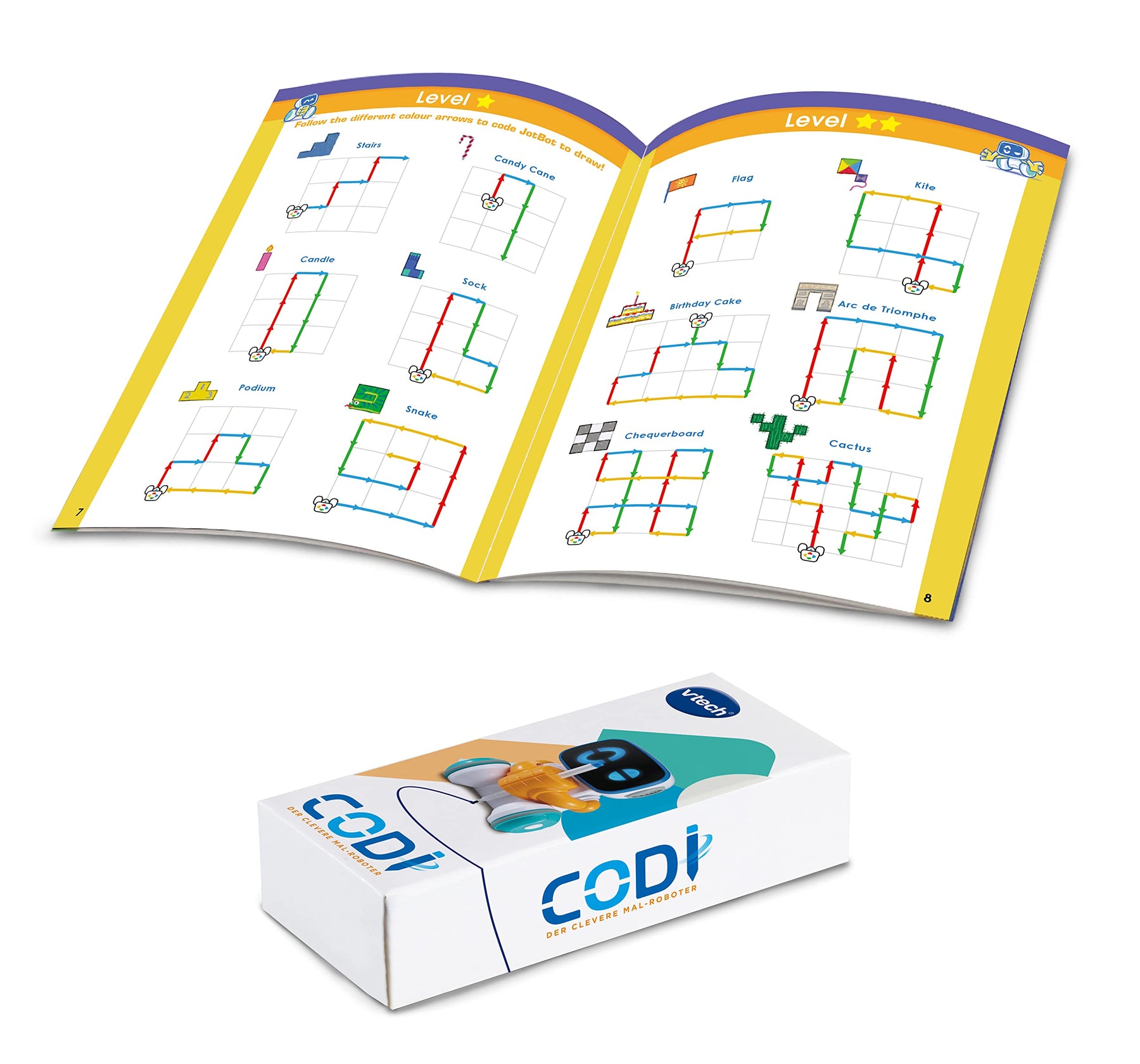 VTech Codi, der clevere Mal-Roboter Mit dem Roboter zeichnen, programmieren und kreativ werden: Codi ist der ideale Freund, um Zeichnungen an- zufertigen, denn er zeichnet von ganz alleine - tolle Zeichnungen programmieren oder das Lieblingsbild zeich- nen lassen. Das Wichtigste auf einen Blick: Zeichnet vorinstallierte oder selbstprogrammierte Motive Mit 15 Chipkarten (doppelseitig) zum Buchstabenlernen und Zeichnen, einem Heft mit 40 Programmierbeispielen und einem Stift Codi erkennt die Größe des Papiers, kann einen Stift (7-10 mm Durchmesser) halten und reagiert auf Einsetzen der Chipkarten sowie auf Drücken der Steuerungstasten 3 Spielmodi: Zeichen-Modus: Wird in Codis Rucksack eine Chipkarte eingesetzt, zeichnet er die entsprechende Form und lädt zum Mit- oder Weiter- zeichnen ein Freies Zeichen: Codi wählt zufällig eins von 99 Motiven oder Spielen aus und lädt zum Mitmachen ein Codier-Modus: Zeichnungen durch Drücken der Steuerungstasten pro- grammieren Beim Zeichnen wird Wissenswertes vermittelt und es werden passende Geräuscheffekte ausgelöst Verschiedene gezeichnete Spiele, darunter Labyrinth, Mandala, Geschichten und mehr Durch Drücken von geheimen Tastenkombinationen überrascht Codi mit besonderen Figuren Durch die 4 LEDs im Gesicht zeigt Codi verschiedene Gesichtsausdrücke Kindersicheres Batteriefach, Abschaltautomatik und Lautstärkeregler Demobatterien enthalten VTech - Cleveres Spielzeug für smarte Kids Kinder lernen nie wieder so schnell, wie in ihren ersten Jahren. Ob Lernlaptop, Kidsphone oder Tablet: Die Pro- dukte von VTech bereiten nicht nur bestens auf die Schule vor, sondern bringen den Vorschulkindern Spiel, Spaß und Lernfreude - für einen optimalen Start in ein Leben voller Möglichkeiten, Wir haben unsere Produkte sorgfältig ausgewählt, die einem Qualitätsstandard von großem Wert entsprechen.
