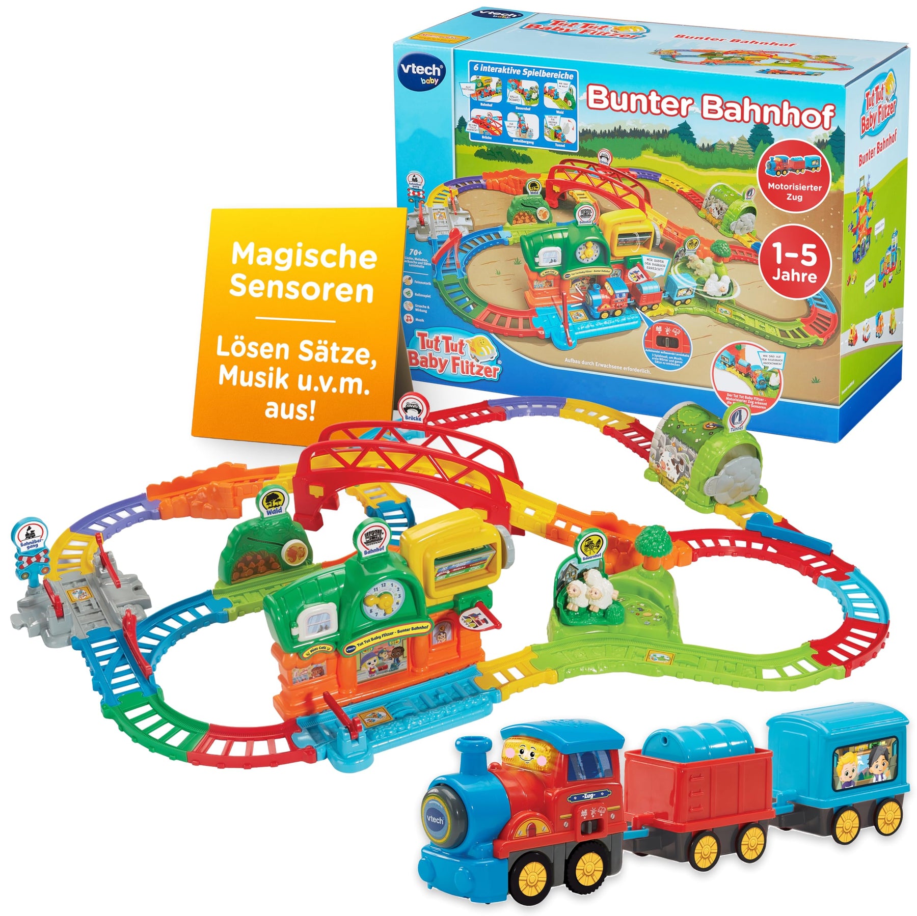 Einzelheiten: Am bunten Bahnhof von VTech ist immer etwas los! Das interaktive Spielset sorgt für spannende Abenteuer und endlosen Spielspaß. Mit dem motorisierten Zug und seinen zwei Waggons erleben Kinder, wie sich der Zug selbstständig über die Schienen bewegt und dabei viele spannende Überraschungen bereithält. Das Set bietet über 19 Schienen, die sich in fünf verschiedenen Varianten aufbauen lassen – so entsteht immer wieder eine neue Strecke. An sechs interaktiven Spielbereichen warten lustige Effekte, Hindernisse und Funktionen, die Kinder zum Staunen bringen: ob am Bauernhof, im Wald, am Bahnübergang oder beim Tunnel – überall gibt es etwas zu entdecken. Über 70 Lieder, Geräusche, Sätze und Melodien fördern spielerisch die Fantasie und animieren zum Mitmachen. Die sechs Magischen Sensoren reagieren auf die Tut Tut Baby Flitzer mit Magischer Erkennung und sorgen für zusätzliche Überraschungen. Das Spielset ist mit allen Produkten der Tut Tut Baby Flitzer-Welt kompatibel und lässt sich nach Belieben erweitern. Mit kindgerechtem Design, sicherem Batteriefach und Abschaltautomatik ist der Bunte Bahnhof ein ideales Geschenk für Kinder ab 1 Jahr.