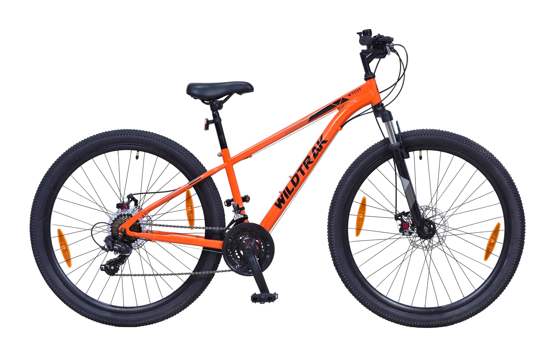 - Dieses Wildtrak ATB mit 27,5-Zoll-Laufrädern (650B) und 21 Gängen hat einen 14-Zoll-Rahmen, eine Vorderradfederung und ist in den Farben in den Farben Orange und Schwarz