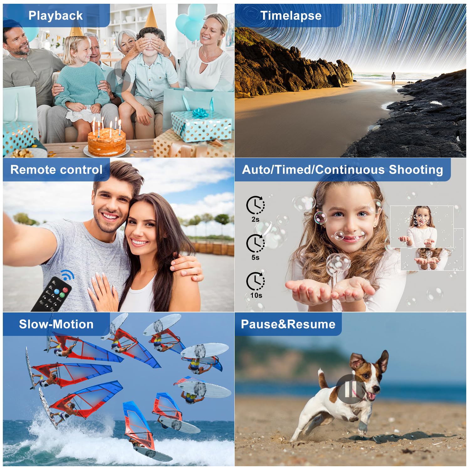 • ❺【Mehrere Aufnahmemodi】Die Kamera bietet mehrere nützliche Aufnahmeoptionen: Mit der Pause-/Fortsetzen-Funktion können Sie die Aufnahme unterbrechen und fortsetzen, ohne separate Dateien zu erstellen. Der Serienbildmodus nimmt mehrere Fotos in schneller Folge auf. Der Zeitraffermodus nimmt automatisch Fotos in festgelegten Intervallen auf. Die Zeitlupenaufnahme erfasst Bewegungen mit höheren Bildraten für eine flüssige Zeitlupenwiedergabe. Dank der Möglichkeit, während des Ladevorgangs aufzunehmen, können Sie die Kamera anschließen und unbegrenzt lange fotografieren.