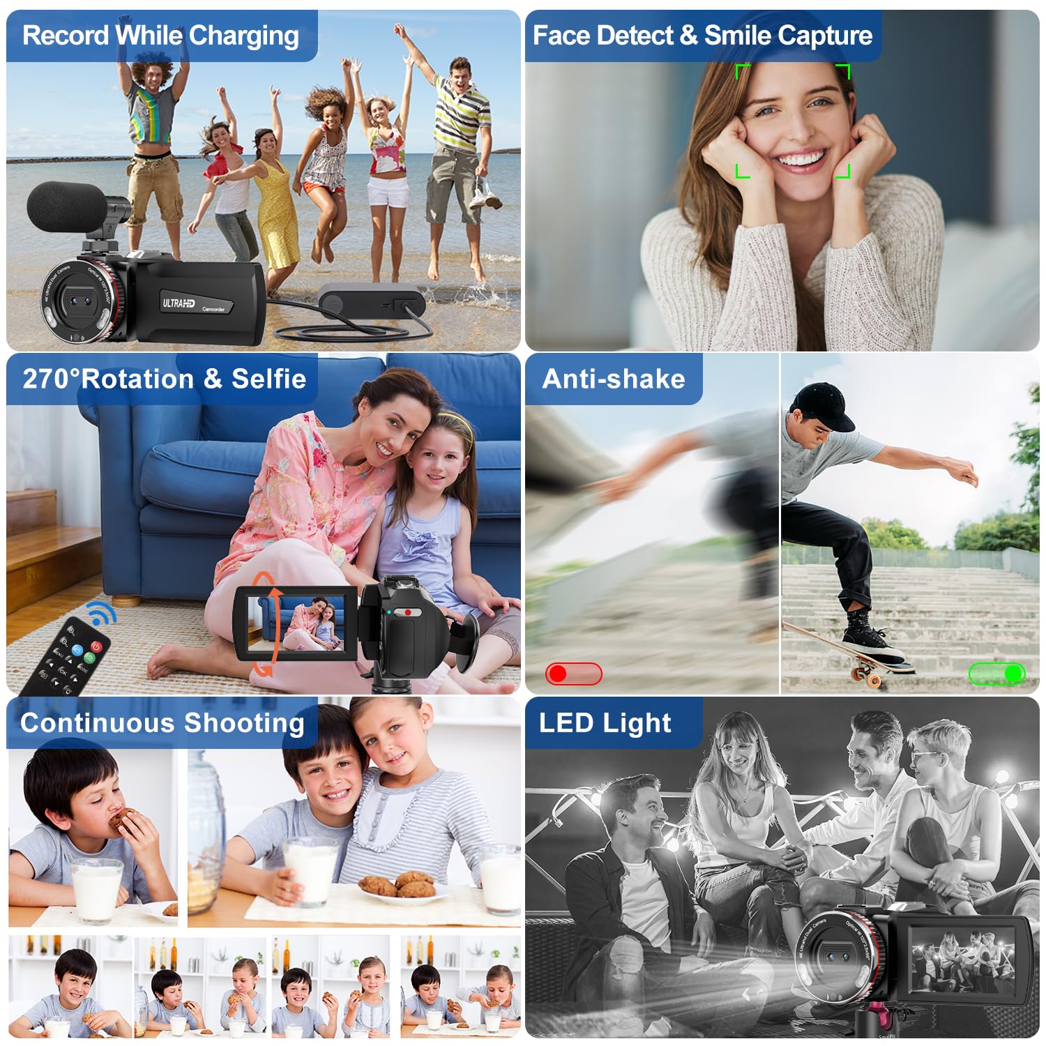 • ❶【4K-Aufnahme】Dieser digitale Camcorder nimmt hochwertige 4K-Ultra-HD-Videos mit 30 Bildern pro Sekunde auf und sorgt so für flüssige Bewegungsaufnahmen. Außerdem kann er Fotos mit einer Auflösung von 48 Megapixeln aufnehmen. Mit dem 18-fachen Digitalzoom können Sie weit entfernte Motive näher heranholen, ohne dass die Bildqualität darunter leidet. Der 3-Zoll-LCD-Bildschirm lässt sich um 270 Grad drehen, sodass Sie flexible Blickwinkel einstellen können, und zeigt Farben präzise an.