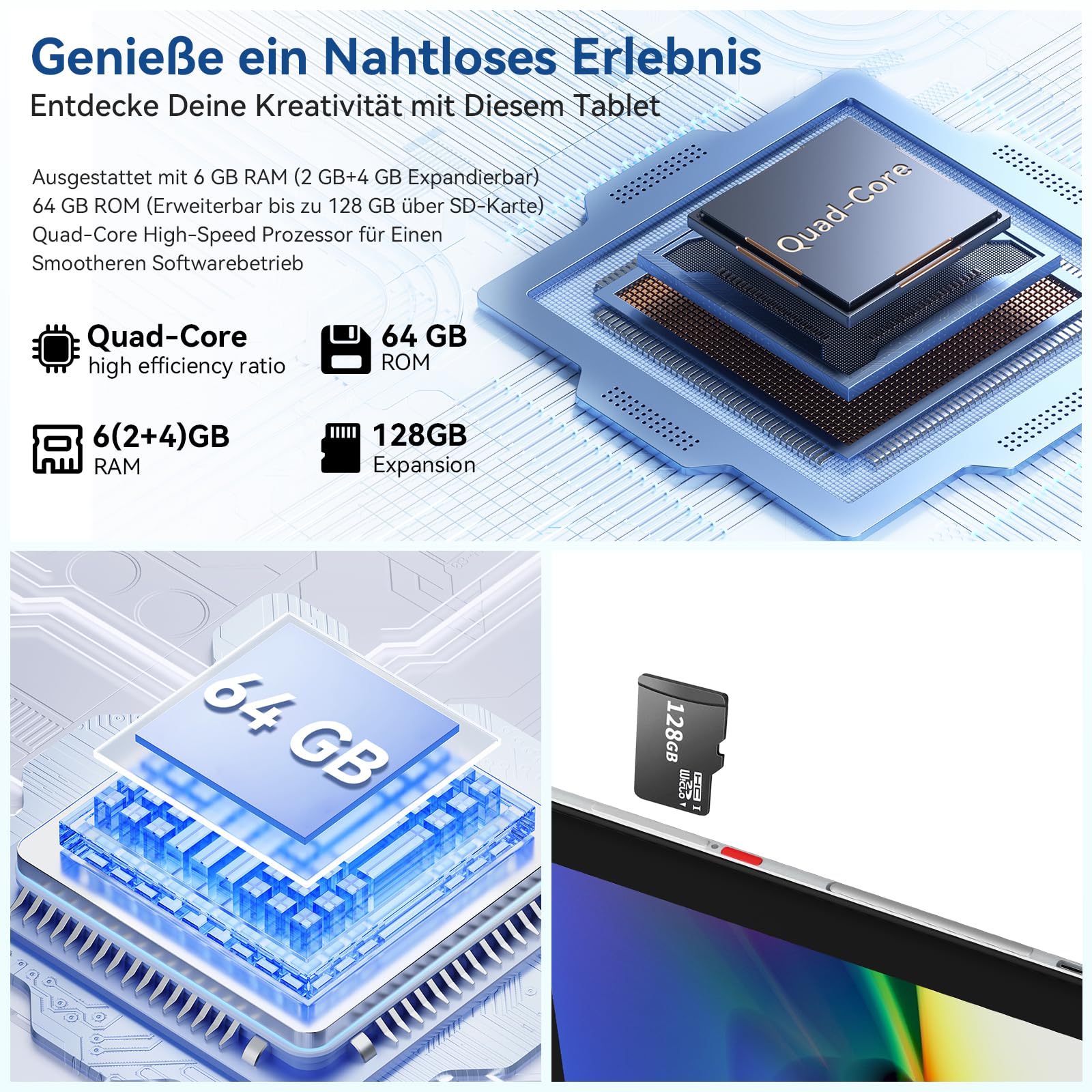 - 【6 GB + 64 GB + 128 GB Erweiterbar】Android-Tablets verfügen über 6 GB (2 GB + 4 GB) RAM, 64 GB ROM und einen SD-Kartenplatz, der auf 128 GB erweiterbar ist. So können Sie einfach Ihre Lieblingsfotos,Videos und Dateien und Anwendungen herunterladen. Sichern Sie eine schnellere und reaktivere Erfahrung, starten Sie Anwendungen schnell und führen Sie leichte Spiele und Videos nahtlos aus. Darüber hinaus wiegt das Tablet nur 540 Gramm und ist nur 8 mm dick,Perfekt komfortables Benutzererlebnis.