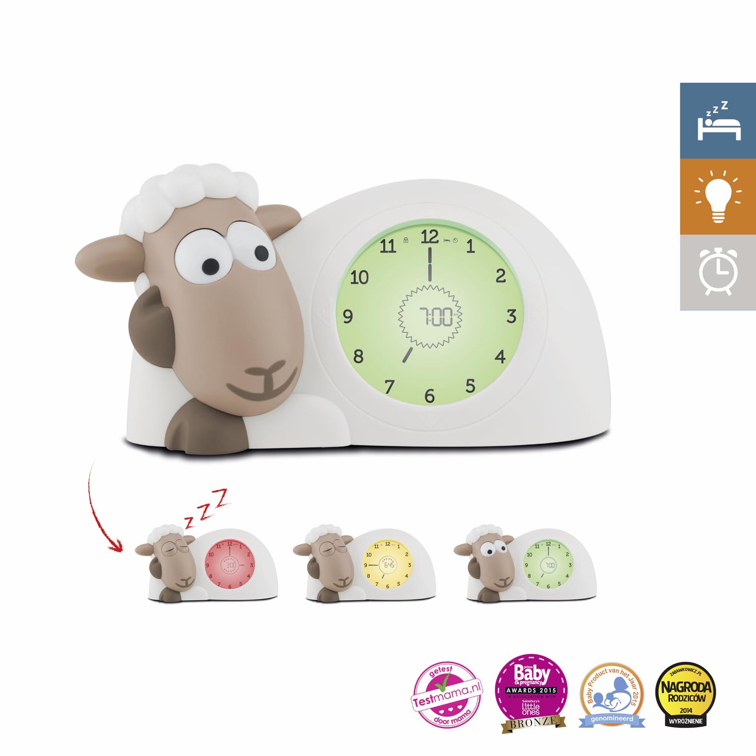 - Intelligent: einfache und intuitive Lichtanzeige mit Rot, was bedeutet, dass es Zeit zum Schlafen ist, Orange zeigt an, dass es noch ein wenig im Bett bleiben muss, und schließlich das Grün zeigt die Zeit zum Aufstehen an. Die Lichtstärke ist einstellbar (4 Stufen). Sam, das Schaf öffnet seine Augen, wenn man aufstehen muss, und schließt sie, wenn es Zeit zum Schlafen ist.