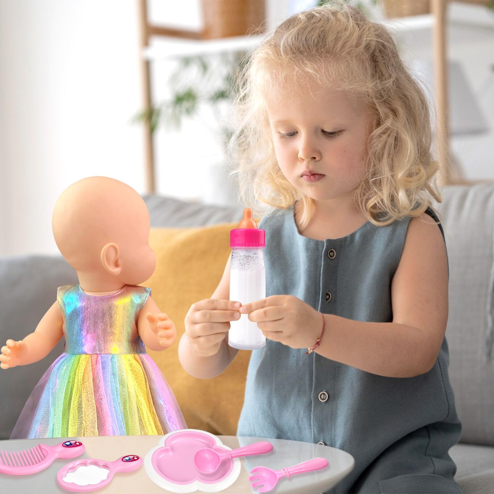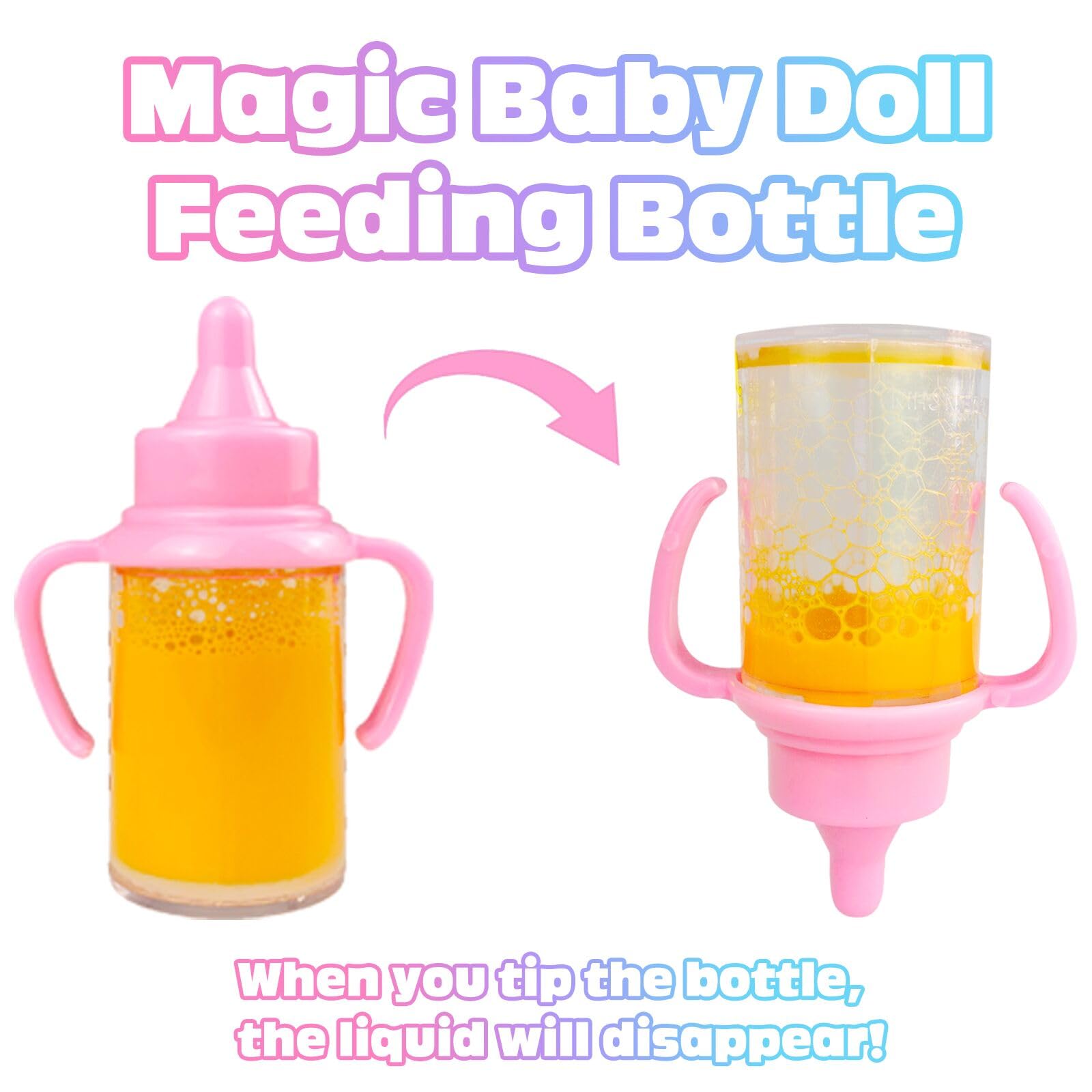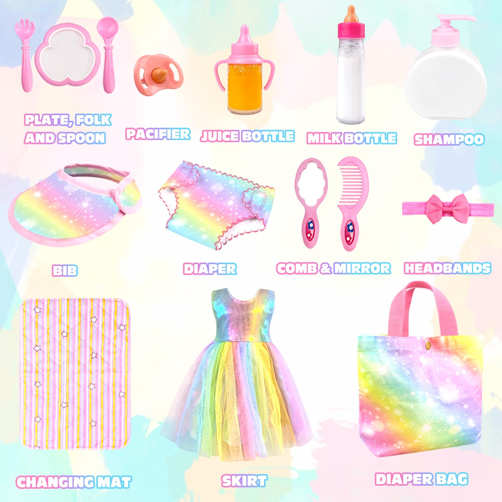 • 15 Pcs di Accessori per Bambole: Il set di alimentazione per bambole include borsa per pannolini, bottiglie di latte e succo, pettine, fasce, fasciatoio, pannolini, vestiti per bambole e altri accessori per bambole.