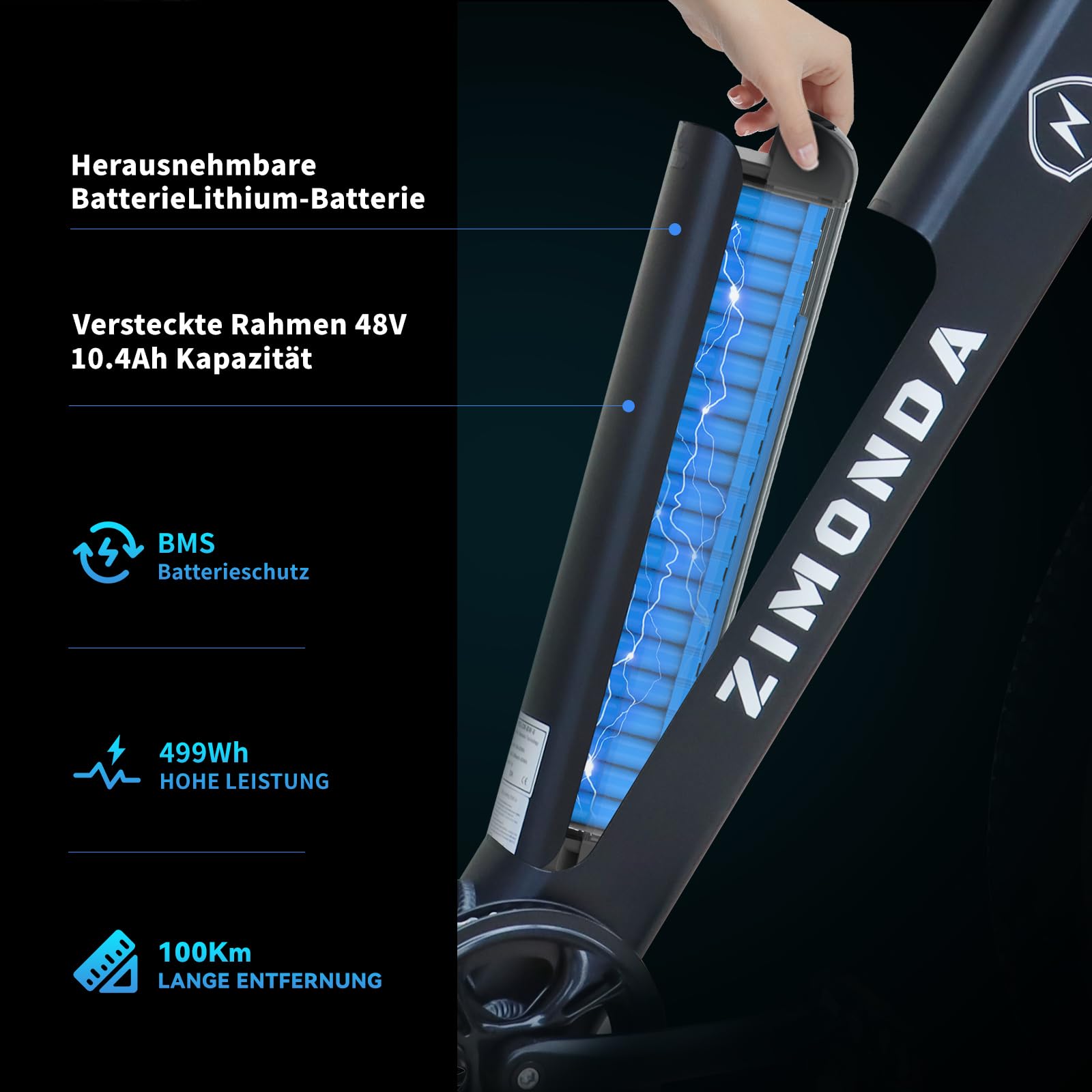 - 【Hochwertiger und sicherer Akku】Ausgestattet mit einem leistungsstarken 48V 10.4Ah Lithium-Ionen-Akku bietet das ZIMONDA Ebike eine Reichweite von bis zu 60 km im Elektromodus und bis zu 100 km im Unterstützungsmodus. Die Zellen des Akkus sind UL-zertifiziert und in den Rahmen des Fahrrads integriert, was nicht nur für ein schlankes Design sorgt, sondern auch die Sicherheit erhöht. Der Akku lässt sich einfach entnehmen, sodass das Laden besonders komfortabel ist. Zudem wird das Ebike direkt aus unserem Lager in Deutschland versendet, sodass es in der Regel in 1-3 Werktagen bei Ihnen eintrifft.