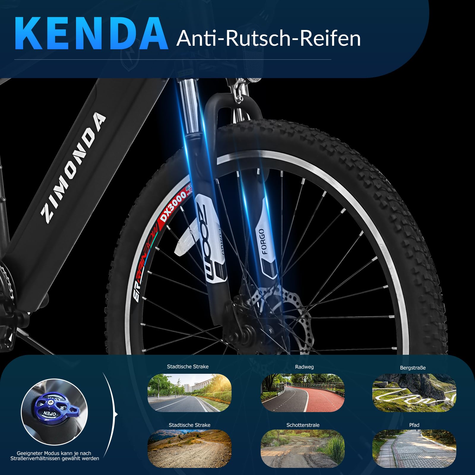 - 【Maximaler Komfort auf allen Wegen】 Das ZIMONDA Ebike verfügt über 27.5-Zoll-Kenda-Reifen, die durch ihre Anti-Rutsch-Technologie auf unterschiedlichsten Untergründen sicheren Halt bieten – sei es auf städtischen Straßen, Bergstraßen oder Schotterwegen. Die arretierbare Federgabel und das präzise 7-Gang-Schaltwerk sorgen für eine mühelose Anpassung an jede Fahrsituation. Der robuste Aluminiumrahmen ermöglicht eine komfortable Sitzposition, was lange Fahrten besonders angenehm macht.