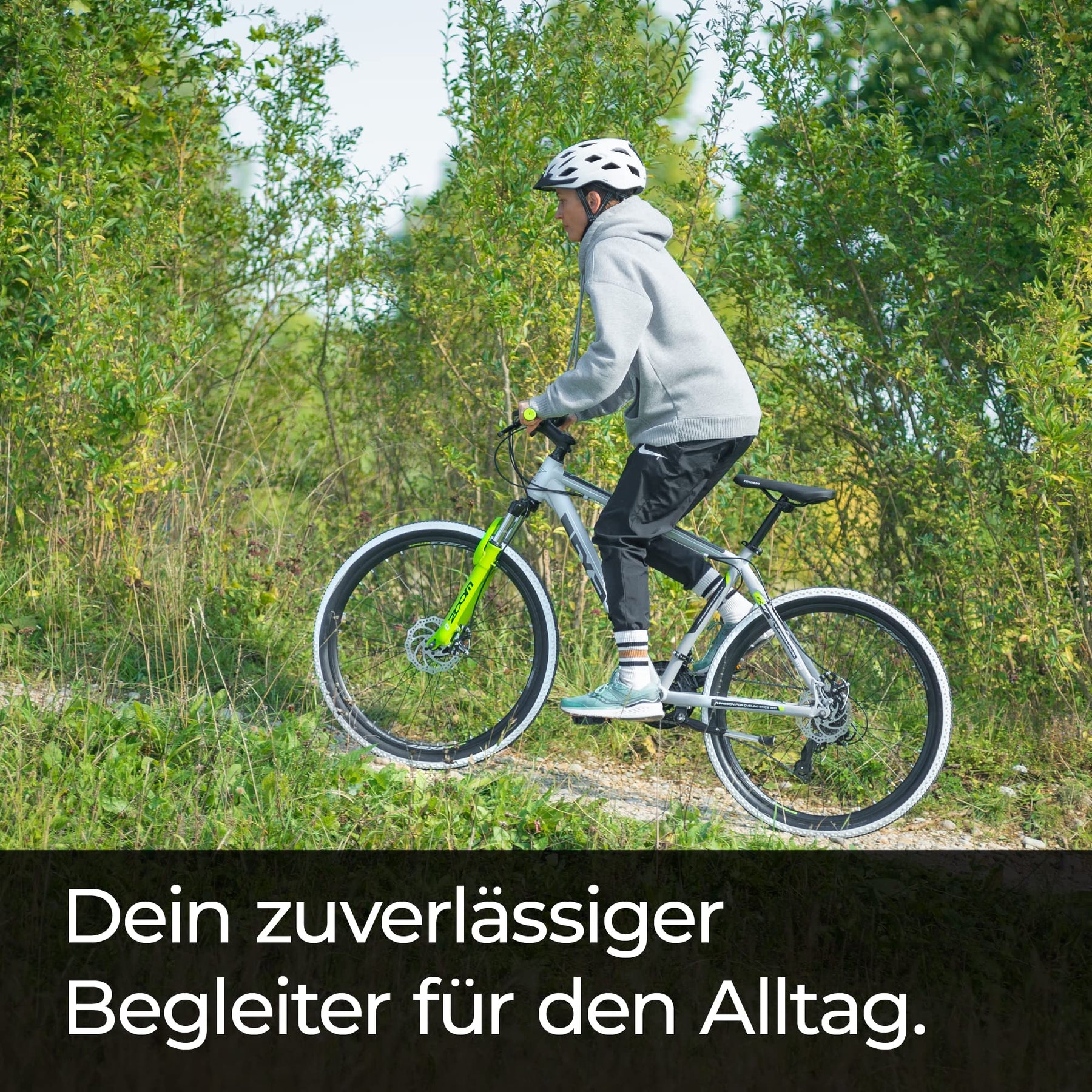 • Der MTB Diamantrahmen ist aus leichtem und robustem Aluminium, die Federgabel mit 80 mm Federweg sorgt für optimalen Fahrkomfort