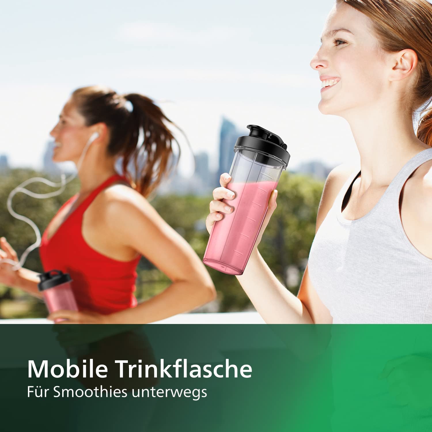 Einzelheiten: Mit dem Philips 3000 Series Standmixer und seinem einzigartigen ProBlend System zaubern Sie glatte Mixturen ohne Klumpen in 45 Sekunden.* Dank dem leistungsstarken 450-W-Motor mit 1 Geschwindigkeitsstufe und Impulsfunktion geht das Mixen von Zutaten mühelos von der Hand und selbst das Zerkleinern von Eis ist kein Problem. Der große Behälter bietet genug Platz für 5 Portionen (bei 200-ml-Gläsern) und reicht damit für die ganze Familie. Dank der im Lieferumfang enthaltenen, praktischen mobilen Trinkflasche können Sie Smoothies außerdem unterwegs genießen. Dieser Küchenhelfer eignet sich ideal als Smoothie Maker, Fruchtmixer, Milchshaker und Cocktailmixer.