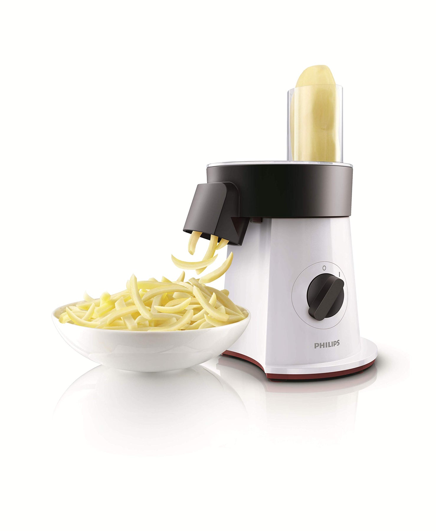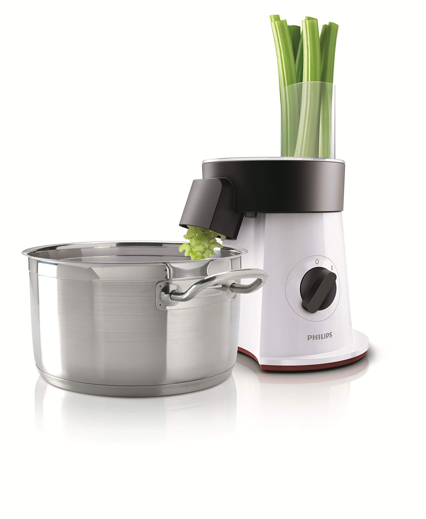 Einzelheiten: Mit dem Philips SaladMaker zaubern Sie frische, selbstgemachte Salate und andere Köstlichkeiten. Ob Gemüse, Käse oder Salami: Dieser multifunktionale Küchenhelfer schneidet, reibt und stiftelt allerlei Zutaten ganz nach Ihren Wünschen. Mit 5 Einsätzen für perfekte Ergebnisse jeder Form und Größe in Sekundenschnelle.