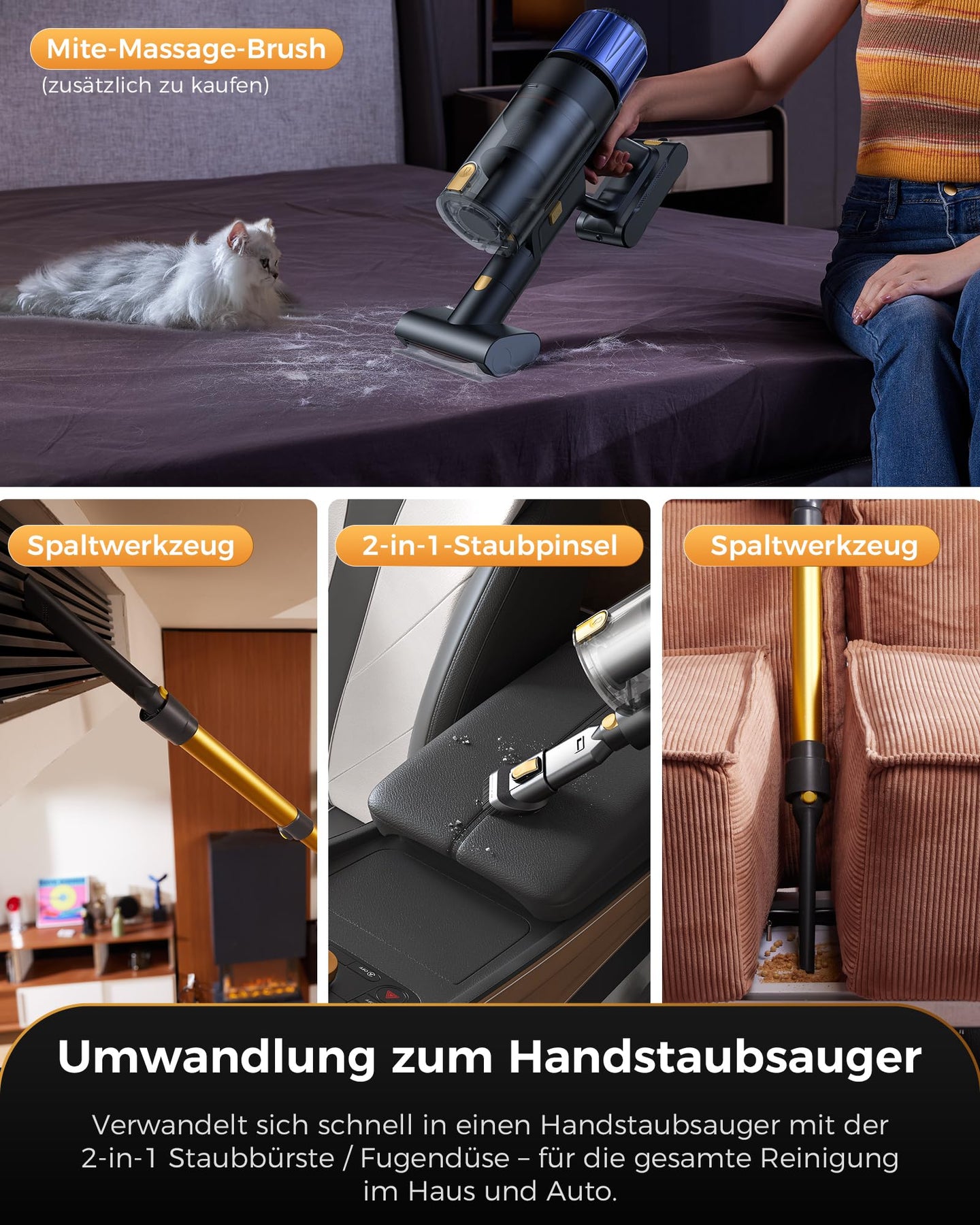 - 【70 Minuten Lange Laufzeit】 Dieser Staubsauger Kabellos verwendet einen 8-Zellen-Akku mit 2500mAh und großer Kapazität. Nach dem vollständigen Aufladen kann es 70Min lang ununterbrochen bei minimaler Saugleistung arbeiten. Reinigt ein ganzes 250 Quadratmeter großes Haus mit einer einzigen Ladung. Der Shop unterstützt den Kauf eines zweiten Akkus.
