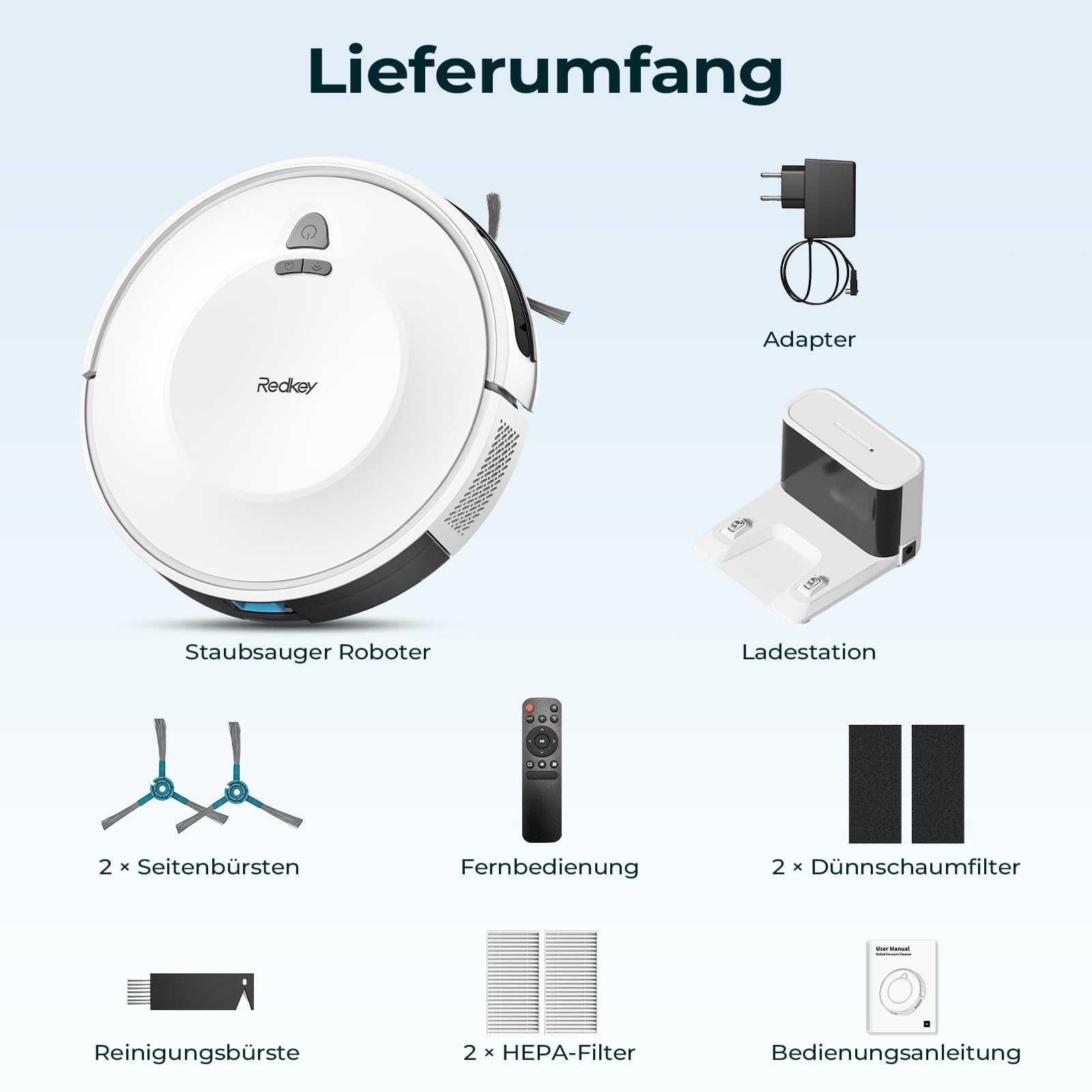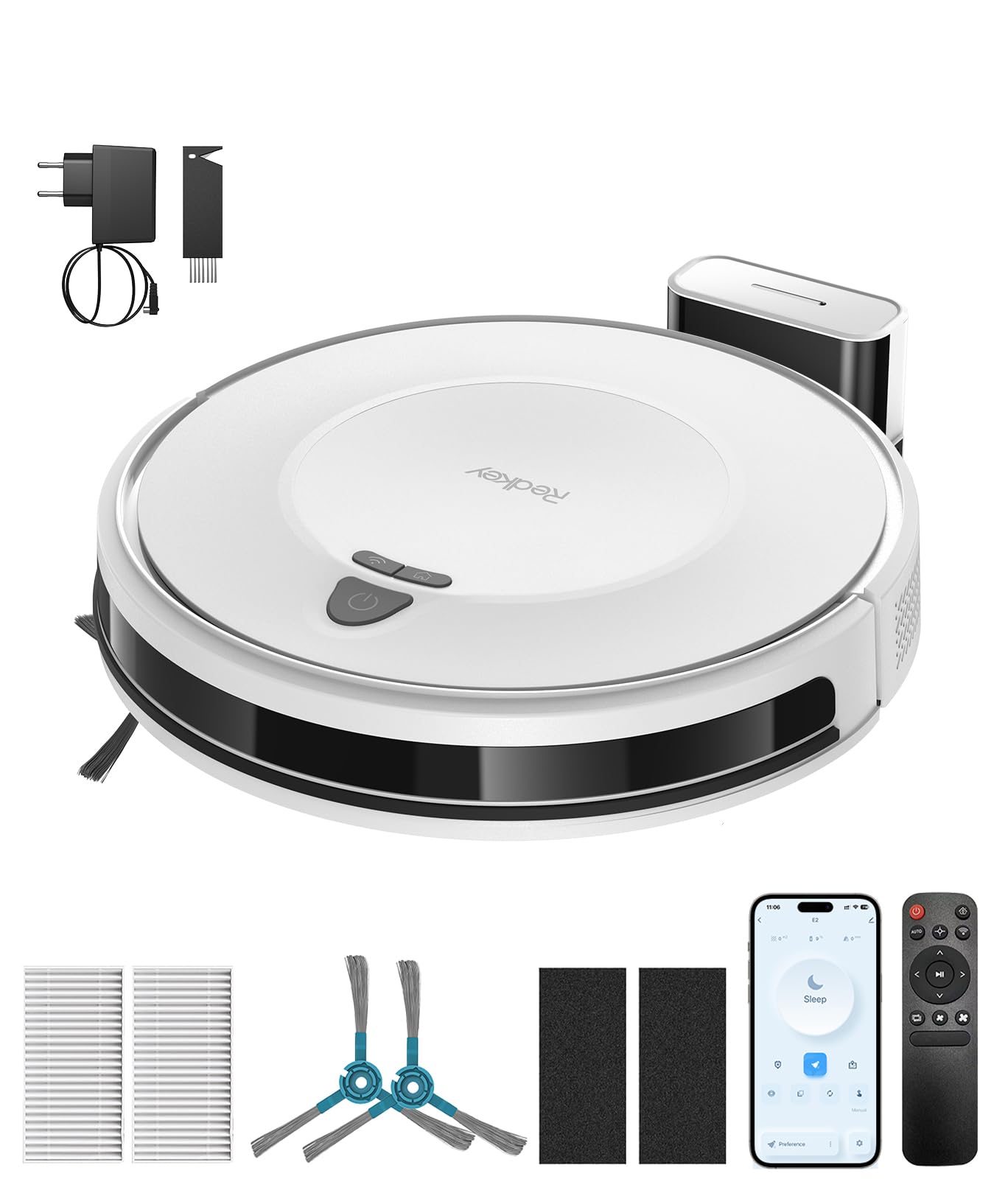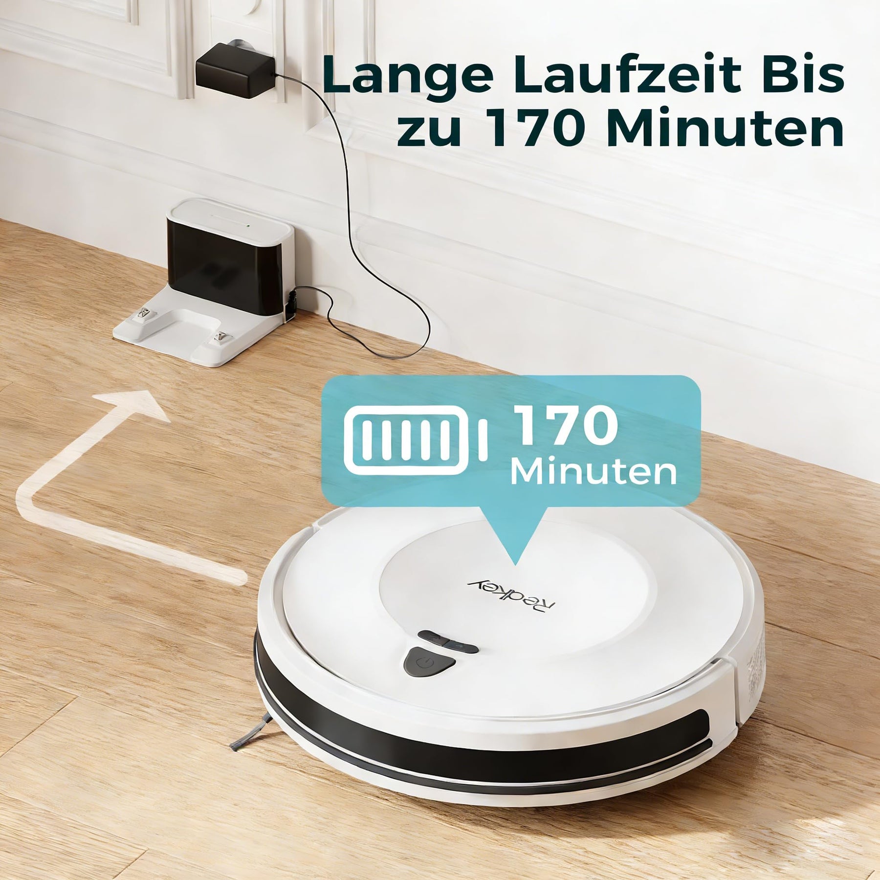 - [ Lange Laufzeit & Automatisches Aufladen ] Im leisen Modus erreicht der Redkey E6 eine Laufzeit von bis zu 170 Minuten und reinigt so auch große Wohnflächen in einem Durchgang. Sobald der Akku schwach wird oder die Reinigung abgeschlossen ist, fährt das Gerät automatisch zur Ladestation zurück und ist sofort für den nächsten Einsatz bereit.