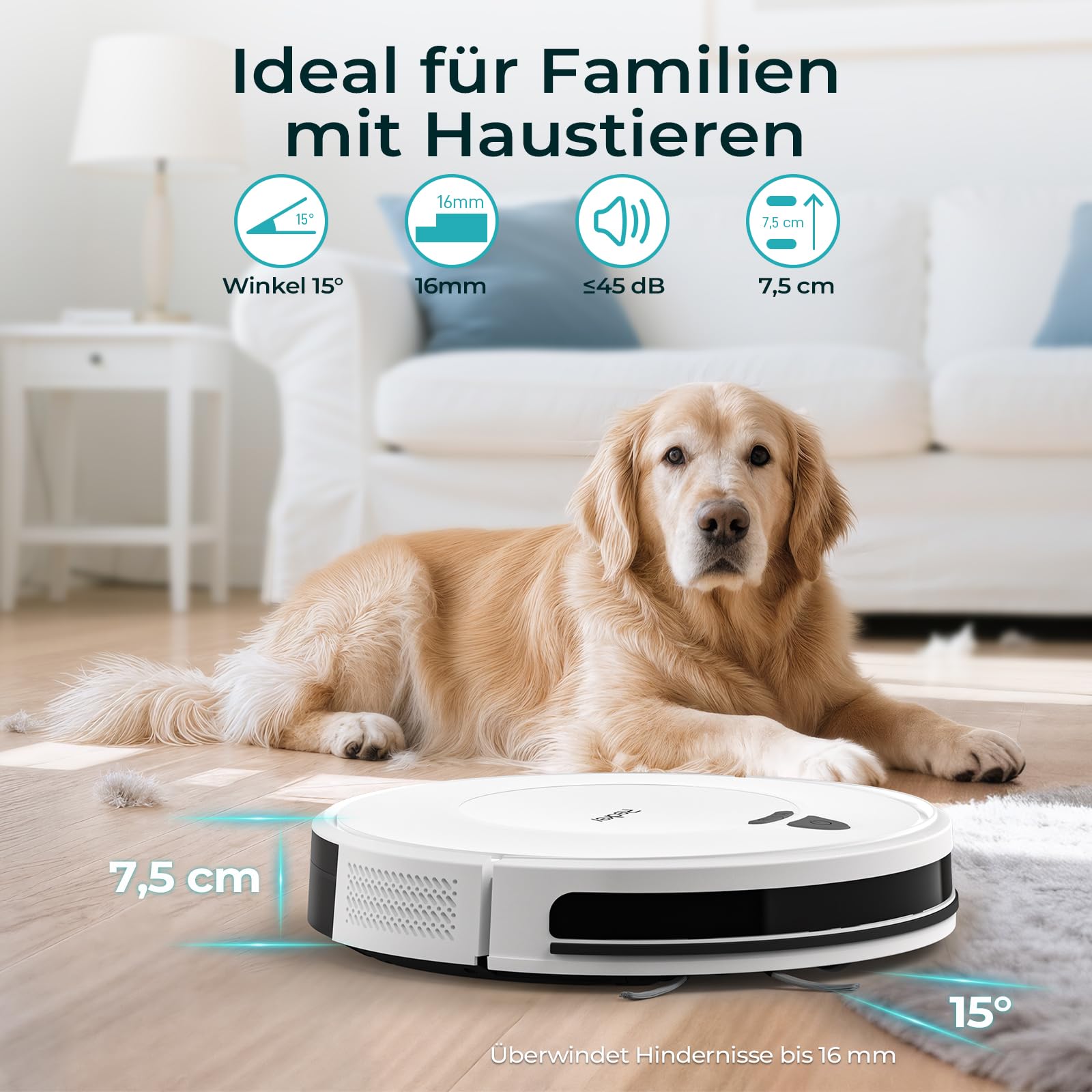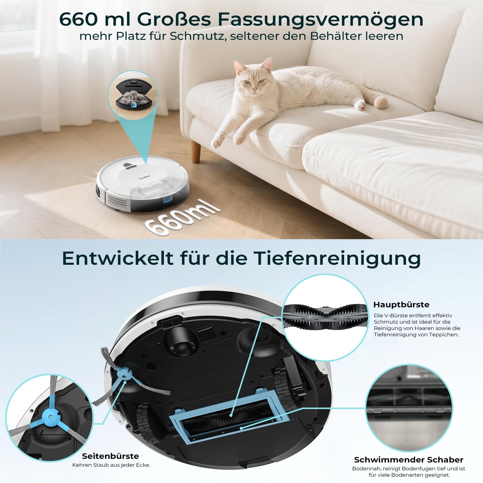 - [ Kompaktes Design & Große Staubbox ] Mit einer Höhe von nur 7,5 cm gelangt der Staubsaugerroboter mühelos unter Betten, Sofas und andere Möbel. Die großzügige Staubbox mit 600ml Fassungsvermögen nimmt viel Schmutz auf, während das dreifache HEPA-Filtersystem feine Staubpartikel zuverlässig zurückhält und so für saubere Raumluft sorgt.