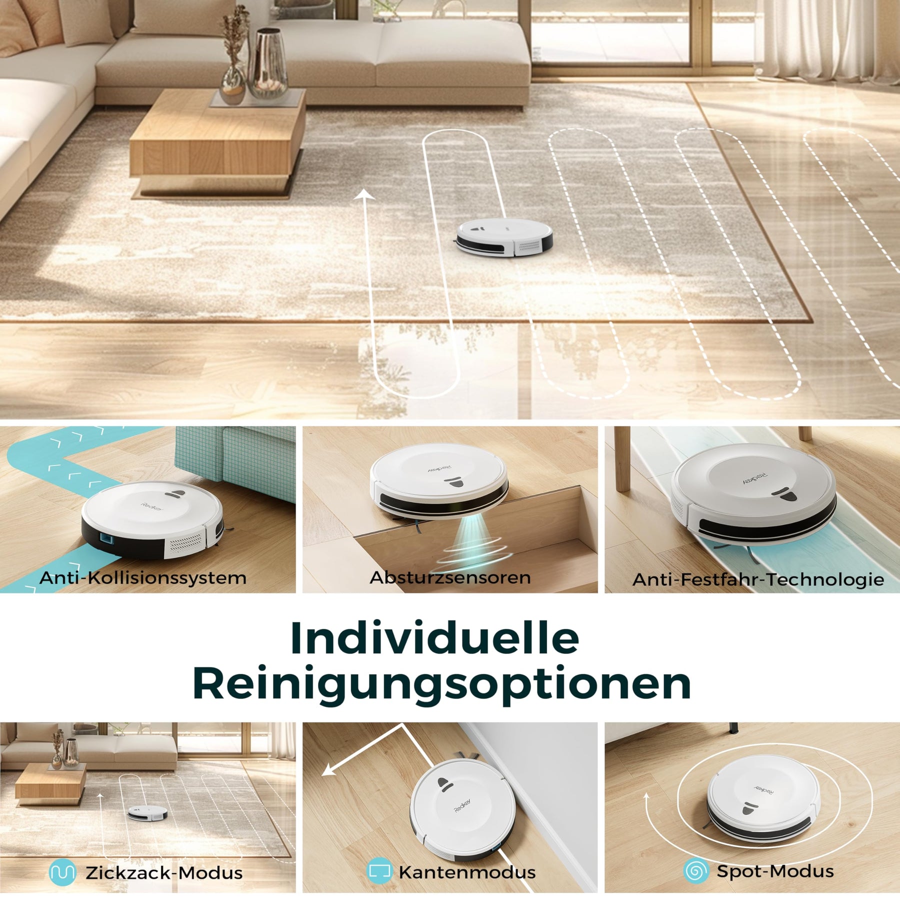 - [ Intelligente Navigation & Schutz durch Sensoren ] Dank dynamischer Zickzack-Navigation reinigt der Roboter systematisch und effizient, anstatt zufällig durch den Raum zu fahren. Präzise Sensoren verhindern ein Herunterfallen an Treppen sowie Kollisionen mit Möbeln und Wänden – für eine sichere und schonende Reinigung in Ihrem Zuhause.