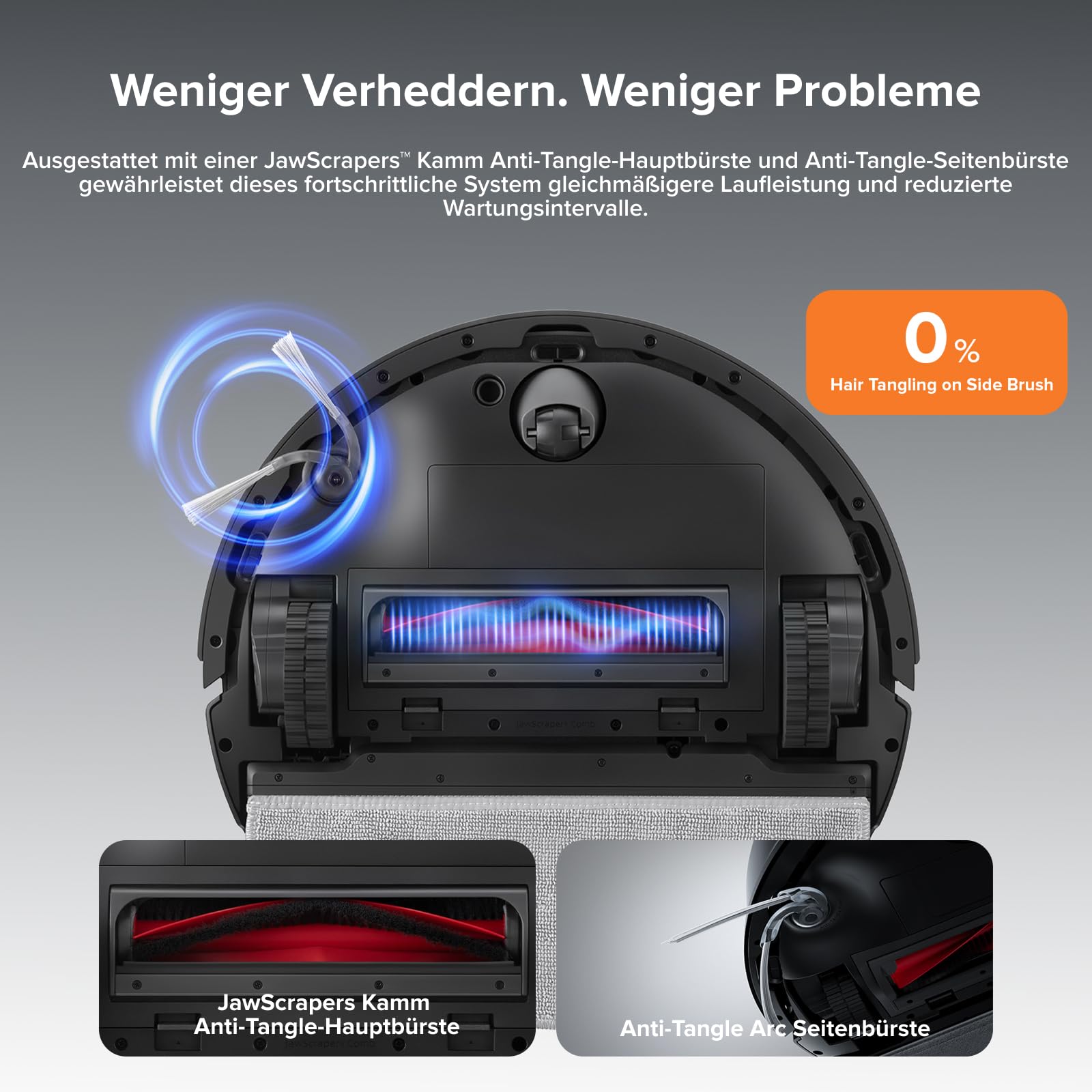 - Dual Anti-Tangle System: Der roborock Q10 X5 ist mit einer JawScrapers-Kamm Hauptbürste und einer bogenförmigen Seitenbürste mit Verhedderungsschutz ausgerüstet, die reibungslosere Reinigung mit weniger Unterbrechungen sicherstellen. Dieses fortschrittliche System minimiert Verhedderungen, sodass weniger ständige Wartung erforderlich ist und eine effizientere und mühelose Reinigungserfahrung ermöglicht wird.