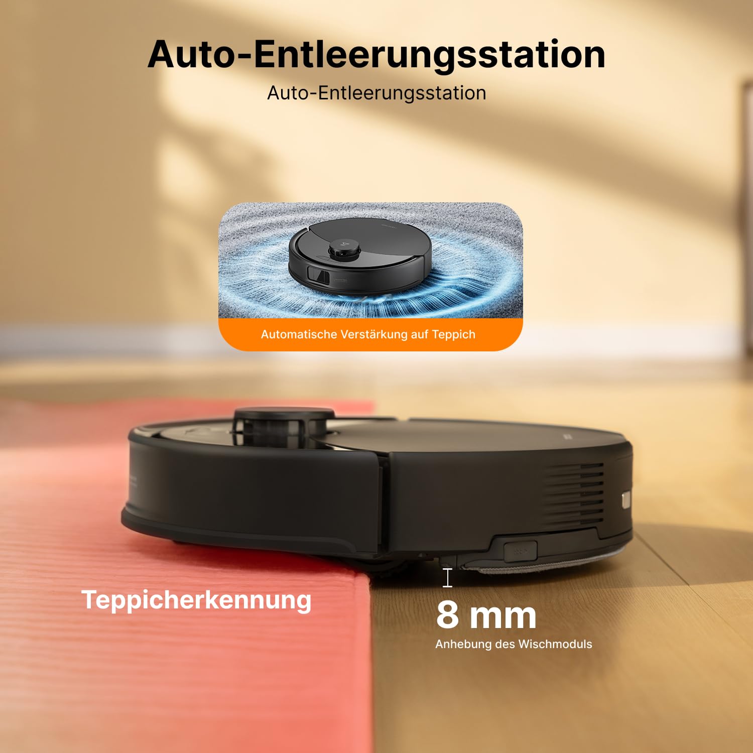 - Tiefenreinigung für Teppiche – ohne Nässe: Bei Teppicherkennung erhöht sich die Saugkraft automatisch, um Staub und Haare aus den Fasern zu lösen, während der Mopp angehoben wird – saubere Teppiche, keine nassen Flecken.