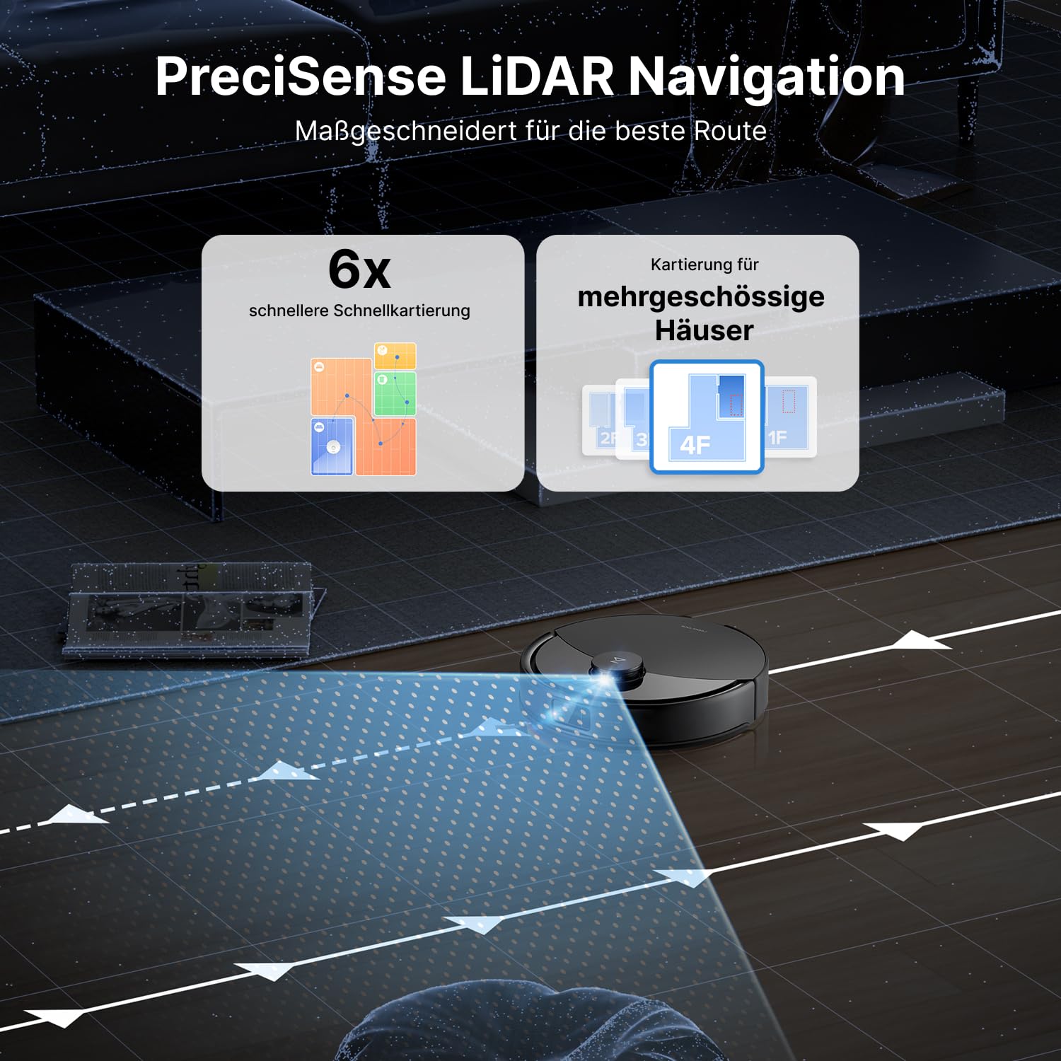 - Smarte Navigation & volle Kontrolle: PreciSense LiDARkartiert Ihr Zuhause 6x schneller, plant effiziente Reinigungswege, erkennt Teppiche, hebt den Mopp und passt sich in Echtzeit an. Steuern Sie alles per App – von Sperrzonenbis Reinigungsplänen, perfekt für Wohnungen mit Haustieren und mehreren Räumen.