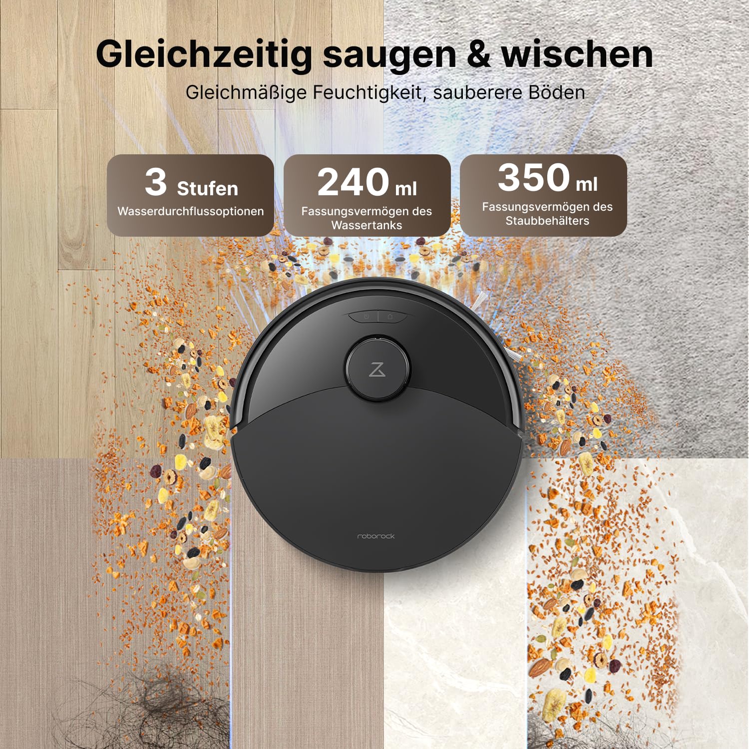 - Wischen und Staubsaugen in einem Schritt: Zeitersparnis durch gleichzeitiges Staubsaugen und Wischen, mit einstellbarem Wasserfluss für Verschüttetes, Flecken und Alltagsstaub.