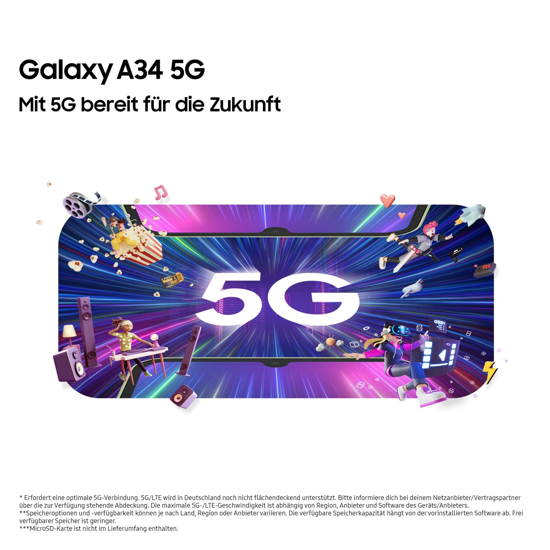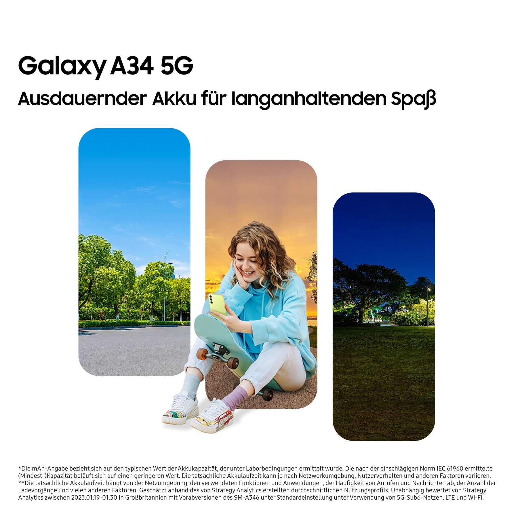 - 5.000 mAh Akku-Kapazität**: Der 5.000 mAh-Akku des Samsung Galaxy A34 5G kann lange durchhalten und auch lange Nächte mitmachen.