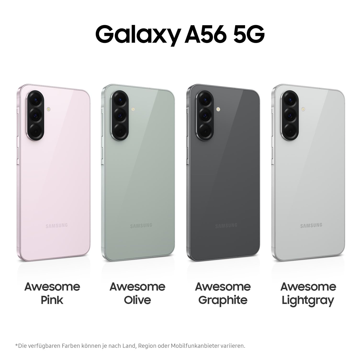 - Bleibe auf dem aktuellen Stand: Das Galaxy A56 5G wird bis zu 6 Generationen an Betriebssystem-Upgrades erhalten und bis zu 6 Jahre lang mit Sicherheitsupdates versorgt werden ¹²