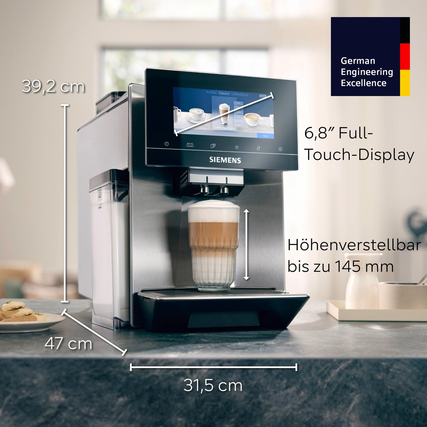 Einzelheiten: Das intuitive Full-Touch Display bietet dir Kontrolle über jede Kaffeenuance - ganz wie ein Barista. Passt alle Getränkeeinstellungen perfekt an die Kaffeebohnen an.