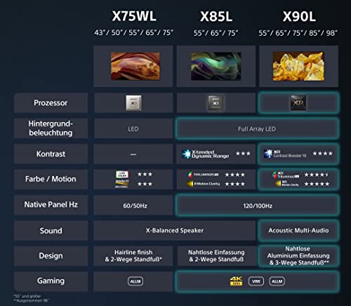Einzelheiten: Einfache, alltägliche Unterhaltung. Das ist der Sony BRAVIA X75WL-Fernseher. Der X1-Prozessor ist die treibende Kraft hinter diesen hellen, farbenfrohen Bildern. Er analysiert Inhalte in Echtzeit und verbessert alles, was man sieht. Die innovativen X-Balanced-Lautsprechereinheiten sorgen für kristallklare Klangqualität, ohne dass der Fernseher dabei an Schlankheit einbüßt. Dolby Atmos und Dolby Vision sind zwei Technologien, die oft mit großen Kinosälen in Verbindung gebracht werden und die in diesem X75WL-Fernseher zum Einsatz kommen. Dolby Vision enthüllt mehr Details in jeder Szene, während Dolby Atmos einen fesselnden Surround-Sound liefert. Mit seinem minimalistischen Design passt der X75WL in jedes Interieur. Hunderte von Filmen warten in der BRAVIA CORE App! Exklusiv für BRAVIA TV-Besitzer ist der Zugriff auf die Bibliothek von Sony Pictures Entertainment mit den neuesten Blockbustern und Klassikern möglich. Hier können 5 Filme in bis zu 4K HDR-Qualität sowie 12 Monate lang unbegrenztes Streaming ausgewählt und eingelöst werden. Das neue spezielle Gaming-Menü umfasst Bewegungsunschärfereduzierung, Schwarzausgleich, Fadenkreuz (in verschiedenen Stilen) und einen anpassbaren Bildschirm, mit dem die Ansicht maximiert und minimiert werden kann, um mehr Details in jeder Ecke eines Spiels zu sehen. Zugriff auf mehr als 700.000 Filme und TV-Episoden aus allen Streaming-Diensten auf diesem Google TV, wobei alles nach den eigenen Interessen organisiert ist. Mit diesem Fernseher bis zu 32 % mehr Energie sparen! Das neue Eco Dashboard fasst alle Öko-Einstellungen an einem Ort zusammen, der intuitiv und benutzerfreundlich ist, sodass ohne viel Aufwand Energie gespart werden kann. * BRAVIA CAM ist kompatibel und lädt ein, Videochats auf dem großen Bildschirm zu genießen, und vieles mehr. Crunchyroll - der größte Anime-Streaming-Dienst der Welt - ist ebenfalls verfügbar, mit einer riesigen Bibliothek von Anime, Manga und anderen Originalinhalten, in einer Vielzahl an Sprachversionen. *Standardeinstellung vs. energieeffizienteste Einstellung mit ECO Dashboard. Verbrauchsunterschied gemessen mit 85X95L, Prozentsatz kann je nach Modell abweichen