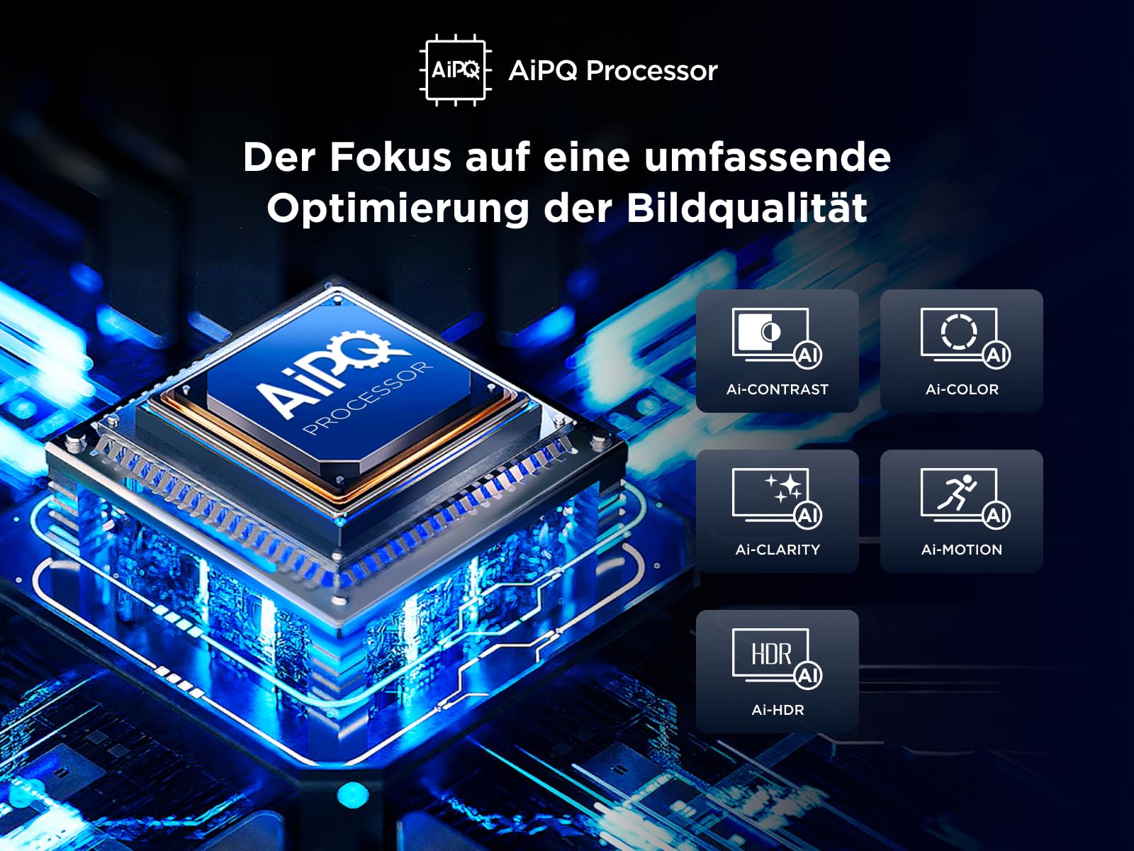 • AiPQTM-Prozessor: Der AiPQ-fähige TCL-Algorithmus verarbeitet Inhalte mit stabiler und hoher 4K-Qualität, klaren und fließenden Bewegungen, hohem Kontrast und feinsten Details