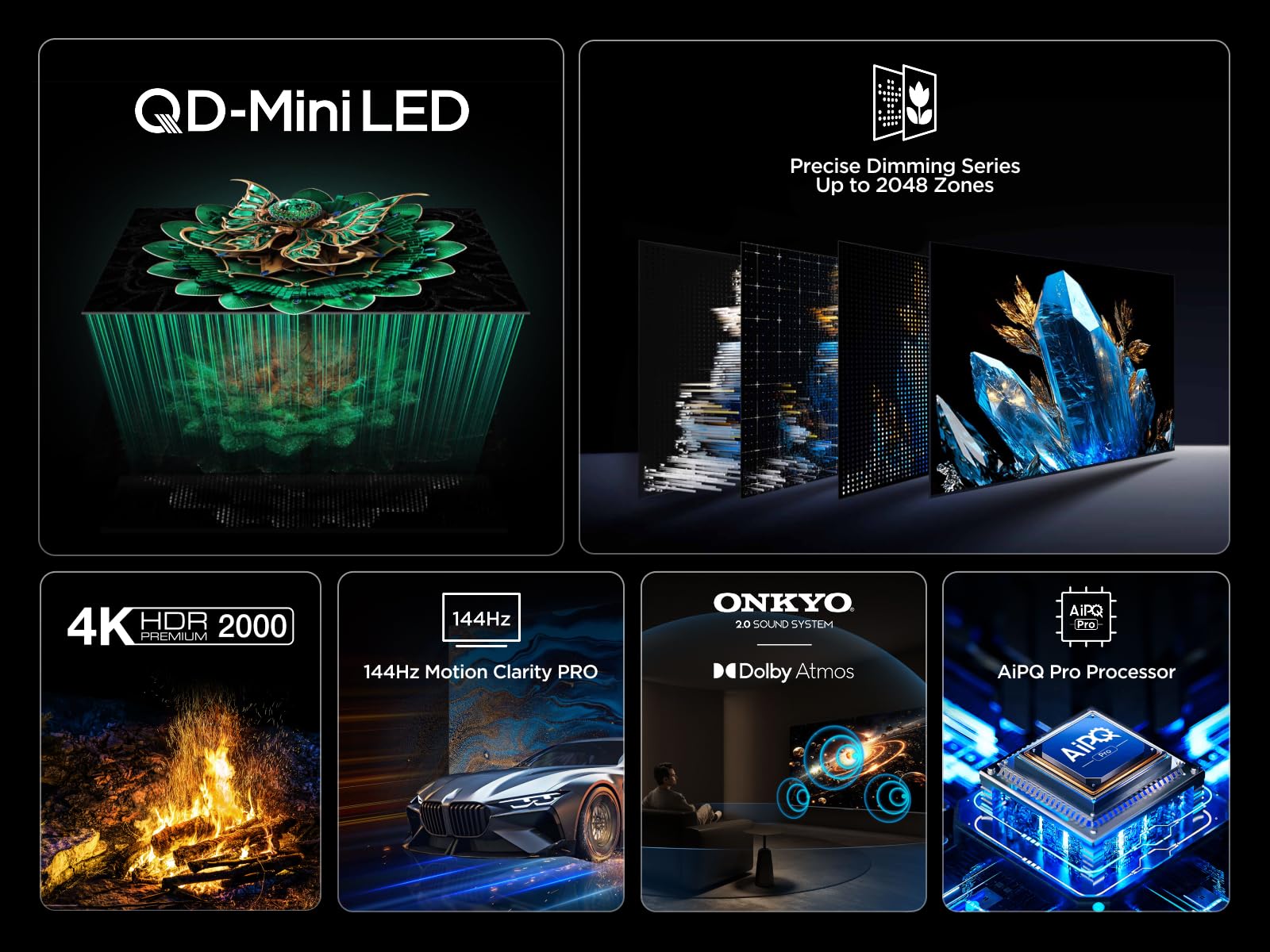 - QD-Mini-LED: Die einzigartige Hintergrundbeleuchtungstechnologie sorgt für ein visuelles Meisterwerk, das erstaunlich lebendige Bilder mit naturgetreuen Farben und einem ultrahohen Kontrastverhältnis bietet. Darüber hinaus bietet es eine höhere Spitzenhelligkeit, eine größere Farbskala, eine größere Bildschirmgröße und eine längere Lebensdauer an. Sie ist die fortschrittlichste Bildschirmtechnologie.