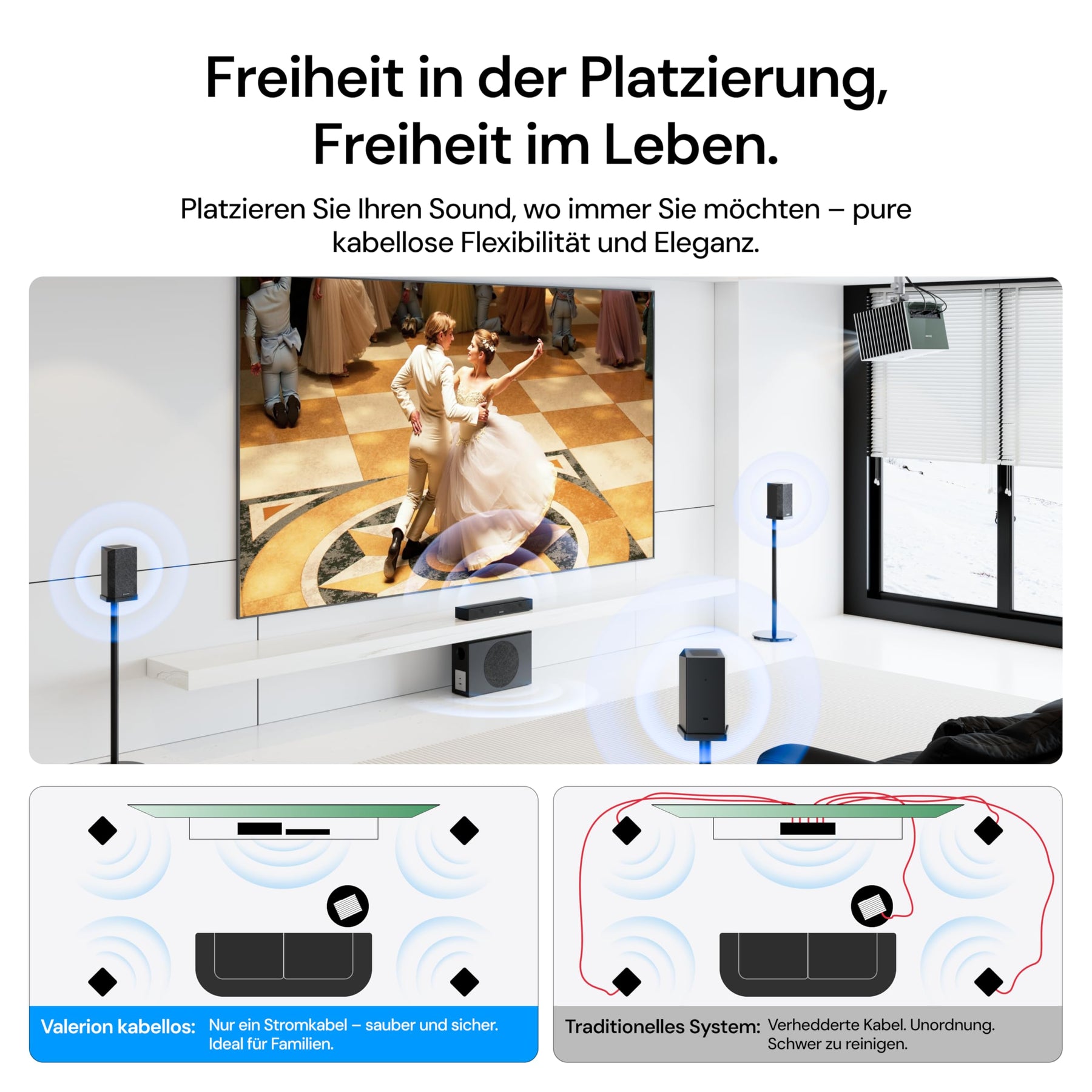 • Kabellos & grenzenlos – echtes 5.1.2 Wireless-Heimkino: Vollständig kabelloses Surround-System ohne Lautsprecherkabel und ohne Installationsaufwand. Nur ein einzelnes Netzkabel – für ein aufgeräumtes Setup und maximale Freiheit bei der Lautsprecherplatzierung.