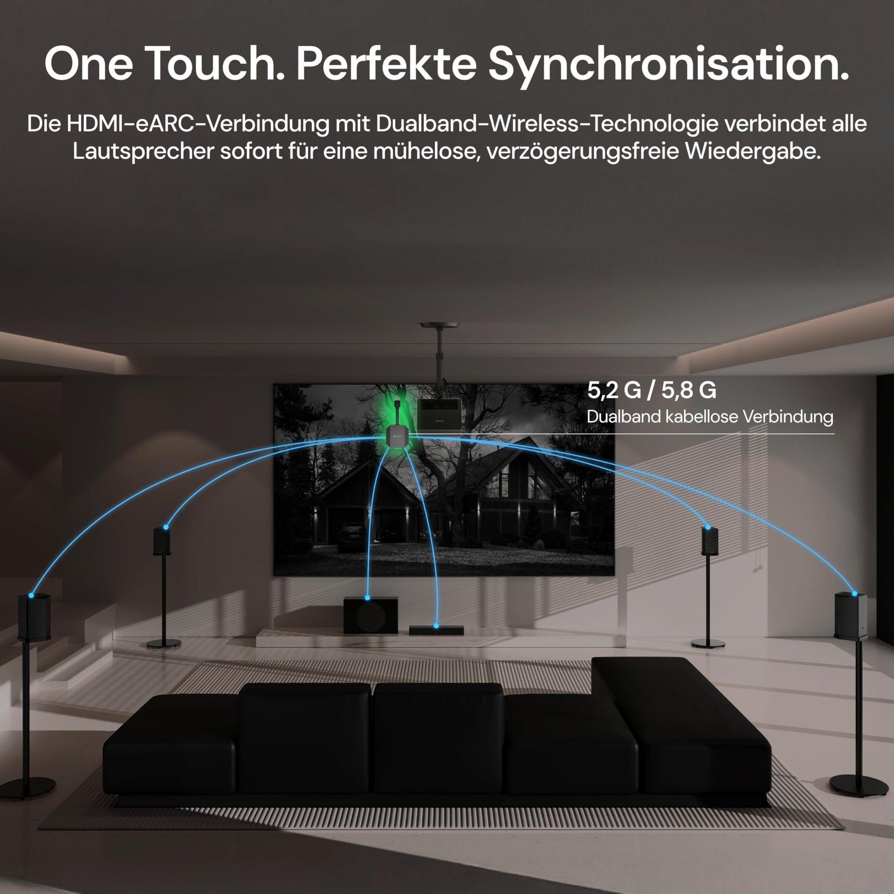 • Unter 30 ms Ultra-Low-Latency – perfekte AV-Synchronisation: Die Dualband-Funktechnologie sorgt für eine extrem geringe Verzögerung von unter 30 ms. Ideal für Filme, Gaming und Sport – ohne wahrnehmbare Audioverzögerung.