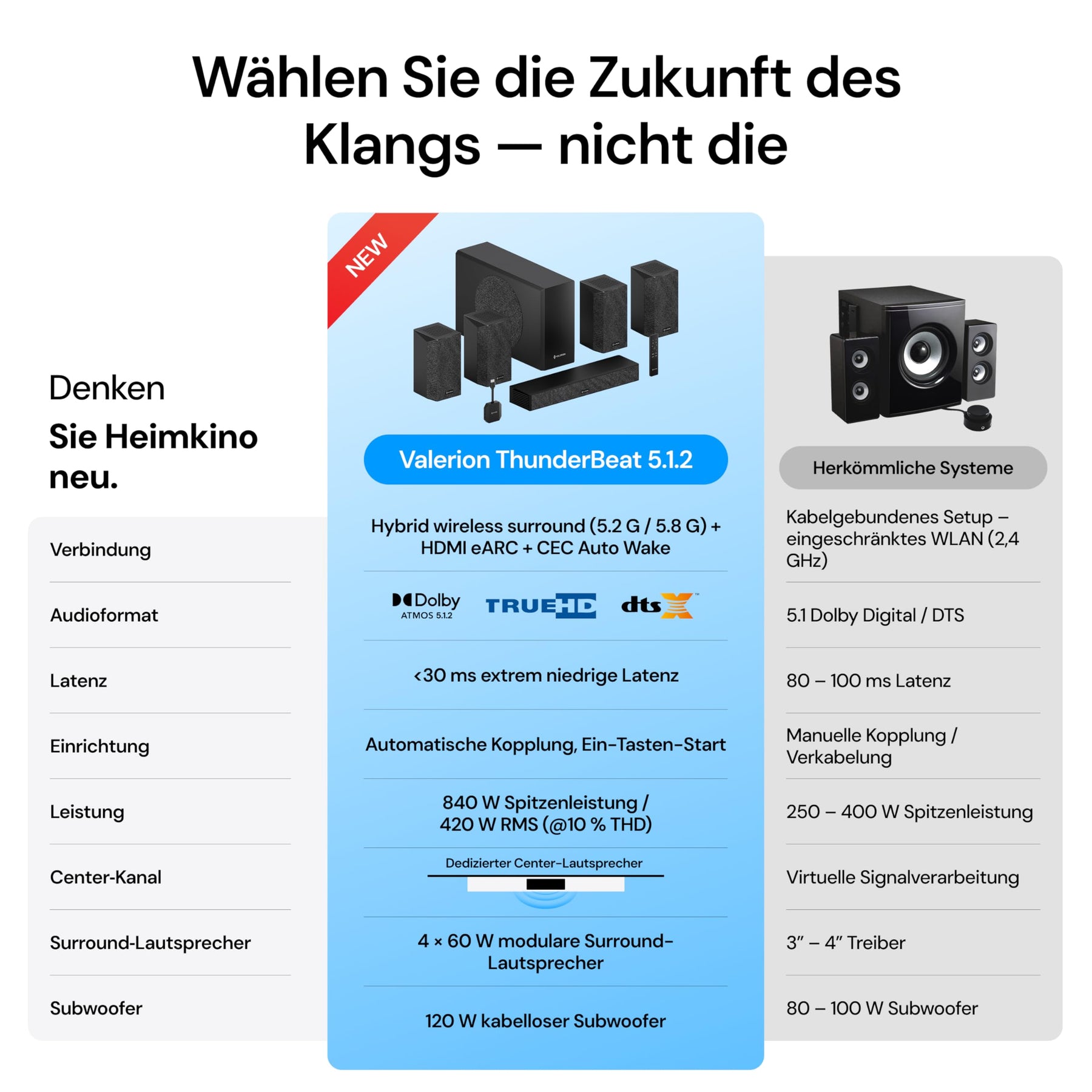 • Hinweis 2: Ein vollständiges 5.1.2 Surround-System entsteht durch die Kombination aus einem ThunderBeat 4.1.2 System und einem Center-Lautsprecher für echtes Dolby-Atmos-Raumklangerlebnis. Das ThunderBeat-System ist ausschließlich für Valerion-Projektoren entwickelt und nicht mit Projektoren anderer Marken kompatibel.